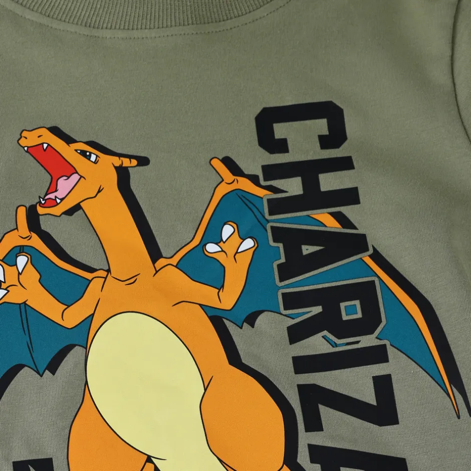 Sej bluse fra Minymo i en dæmpet olivengrøn farve, der giver et moderne og stilfuldt udtryk. Fronten prydes af et stort og karakteristisk print med en dragefigur fra Pokémon-universet, som tilføjer et eventyrligt og energisk touch. Blusen har lange ærmer og en klassisk rund halsudskæring, der sikrer god komfort og nem påklædning. Et oplagt valg til børn med hang til Pokémon og cool designs.