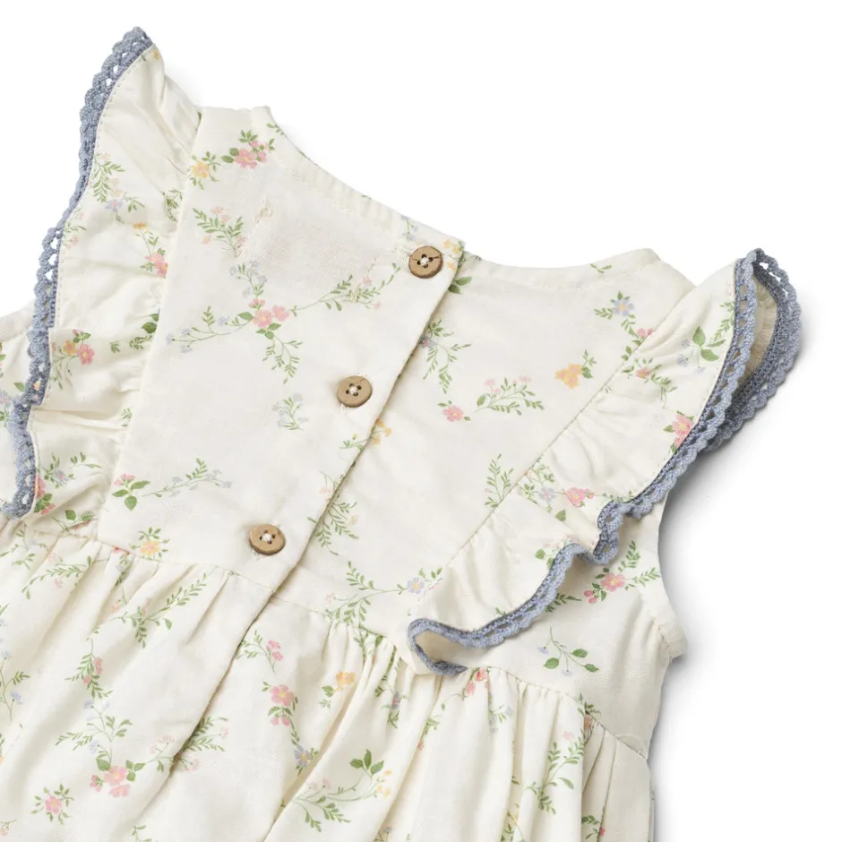 Wheat’s sommerdragt er både søde og behagelige at have på og bevæge sig i. Kjolepasningen er praktisk, da den er en kombination af en løstsiddende kjole med bunden af en klassisk bodystocking indenunder. Kjolen har en flatterende linje med samlinger, hvilket giver kjolen noget dejlig volumen. Den har knaplukning bagpå for at gøre det lettere for dig at klæde din baby på. Bodyen har trykknapper i bunden, hvilket gør det nemt at komme til din babys ble.
