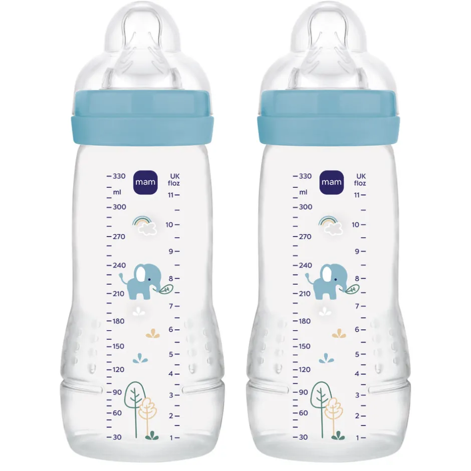MAM Easy Active Baby Bottle 330ml 2pk Blue er det perfekte valg til både baby og forældre, der ønsker en praktisk og komfortabel flaske. Flaskerne har et ergonomisk design, som gør dem nemme at holde for både små og store hænder. Den bløde silikone sut giver en naturlig følelse, der minder om mors bryst, og den indbyggede anti-kolik ventil sikrer et jævnt flow og mindsker risikoen for luft i maven. Med en kapacitet på 330 ml er flaskerne ideelle til både mælk og vand, og de fine blå detaljer gør dem ekstra søde. Sættet indeholder to flasker, så du altid har en ekstra ved hånden.Specifikationer: