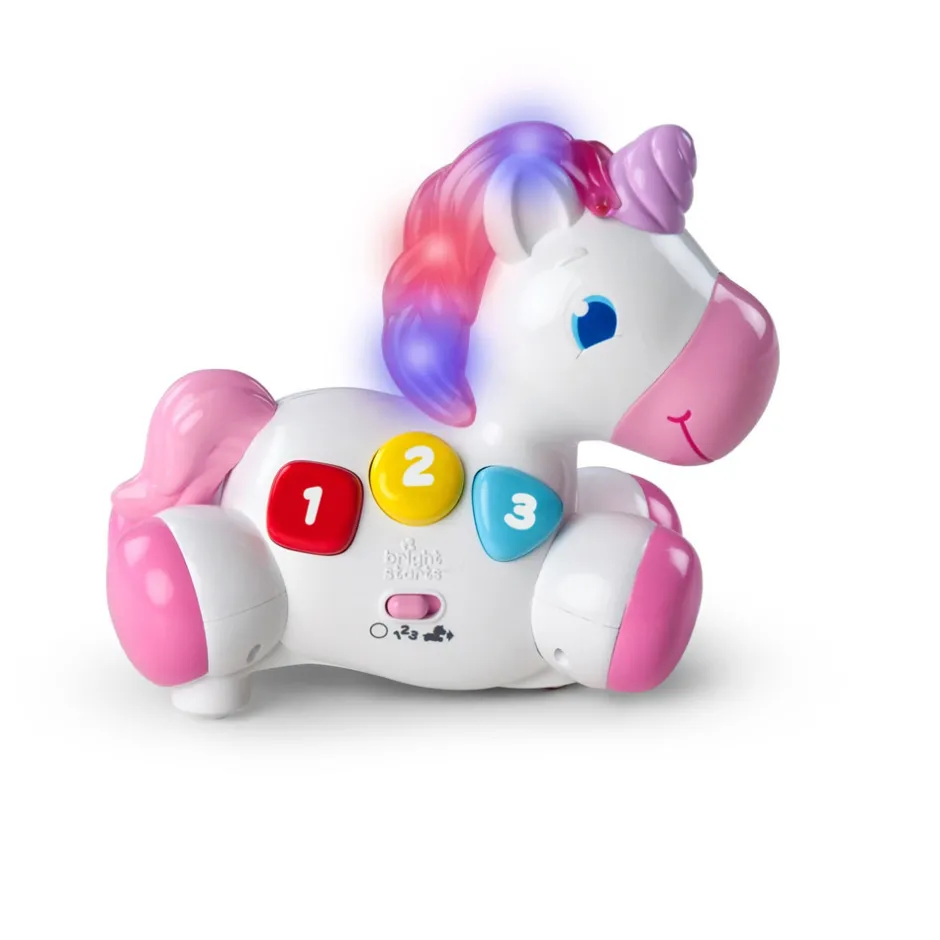 Hvem siger enhjørninger ikke findes? Ved blot et tryk på enhjørningens magiske horn begynder de sjove melodier at spille. Din baby vil opleve en magisk verden med farver, lys, lyde, tal og figurere. Vælg mellem de to sjove spillemetoder, den ene i stilstand og den anden i bevægelse som får baby til at kravle efter sig. Din baby vil elske denne enhjørning som er fuld af overraskelser.