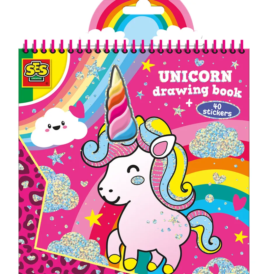 Indeholder: enhjørnings skumhorn, som kan ses igennem alle sider, 15 ark, der kan farvelægge, 40 blanke klistermærker, skumenhjørning, matchende klistermærker.