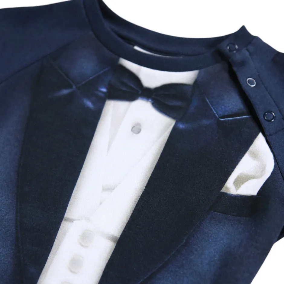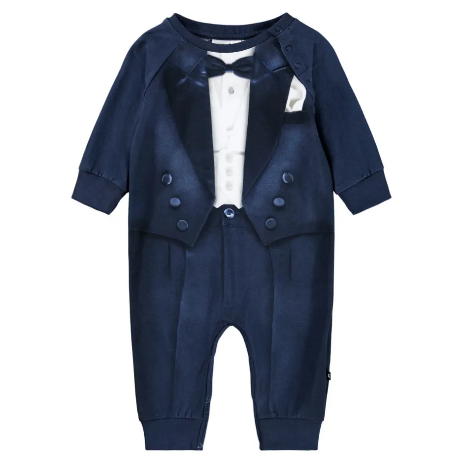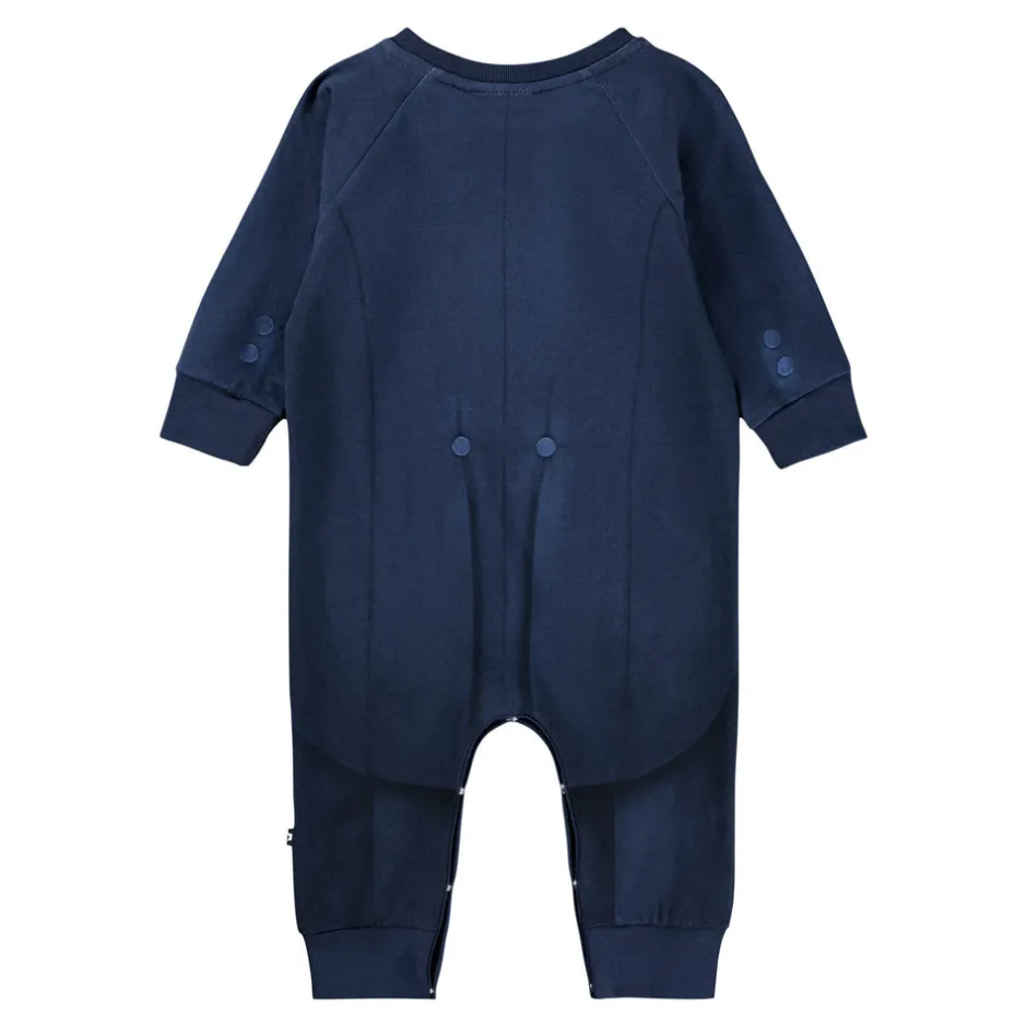 Heldragt i blød, økologisk bomuldsjersey med et sjovt jakkesæt-print. Dragten har lange ærmer og ben, ribkanter ved afslutningerne samt trykknapper på den ene skulder og mellem benene for nem omklædning.
