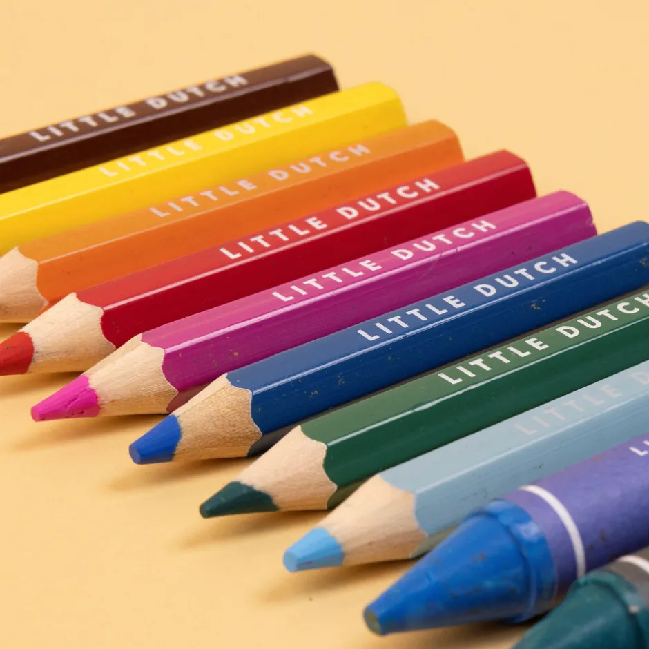 De søde farveblyanter kommer i 8 muntre farver og med en matchende blyantspidser. Blyanterne er nemme at få fat i og kontrollere, hvilket gør dem ideel for en lille kunstner.