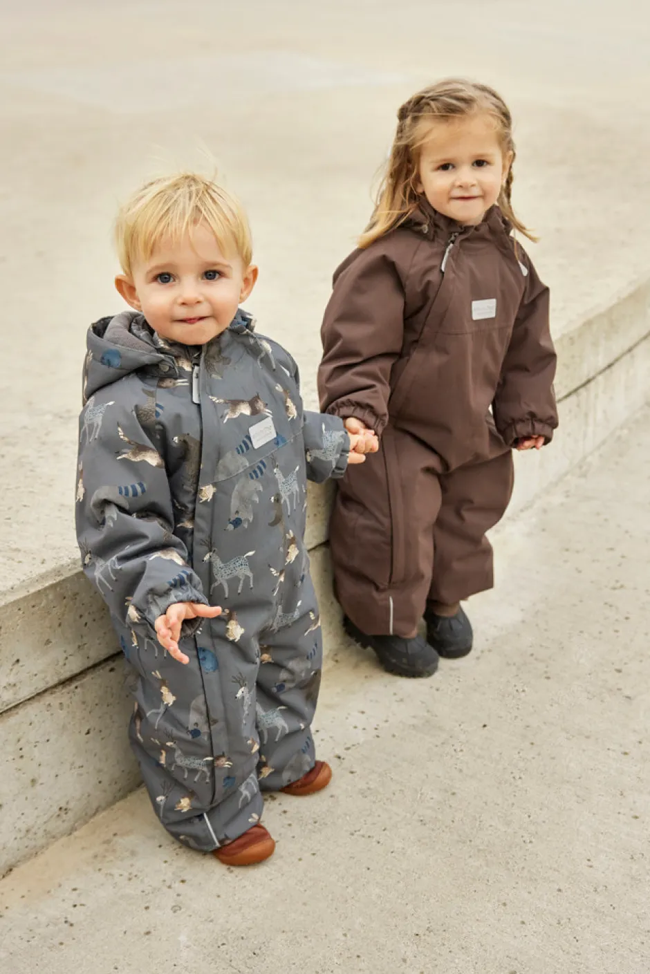 Varm og funktionel snedragt fra Minymo med et flot all-over print. Dragten er fremstillet i 100% polyester og har blødt fleecefor indvendigt for ekstra komfort. Den er udstyret med praktiske detaljer som aftagelig hætte, aftagelige gummistropper ved fødderne samt elastik ved håndled og ankler for optimal pasform. Refleksdetaljer øger synligheden i mørke, og de to lynlåse i siderne gør den nem at tage af og på. Dragten er både åndbar og vandtæt med et vandsøjletryk på 10.000 mm og en slidstyrke på 60.000. Imprægneret med BIONIC FINISH® ECO og certificeret i henhold til GRS – lavet med over 50% genanvendt materiale.