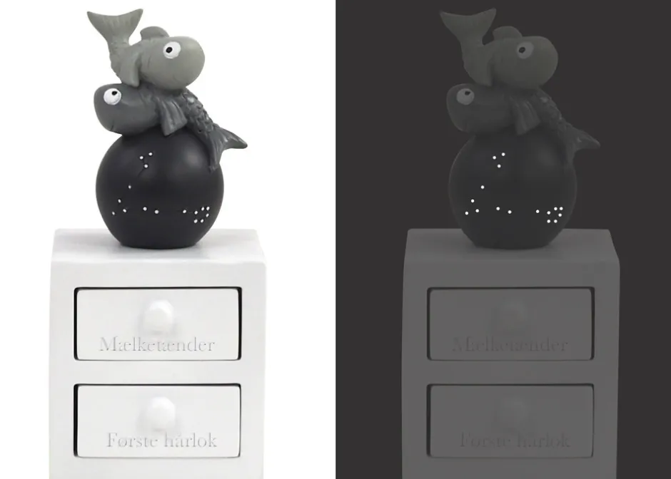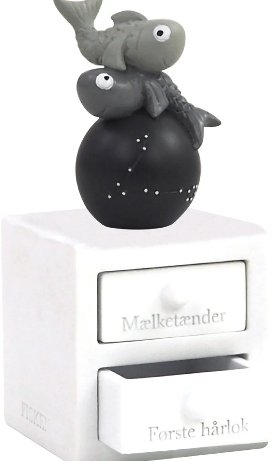 Første tand og hårlok æske med fisken stjernetegn, med planet og stjernebillede, som lyser i mørket. Figuren har to skuffer – En til første tand og en til hårlok. Super fin dåbsgave ide. Æsken er håndmalet så der kan være variationer.