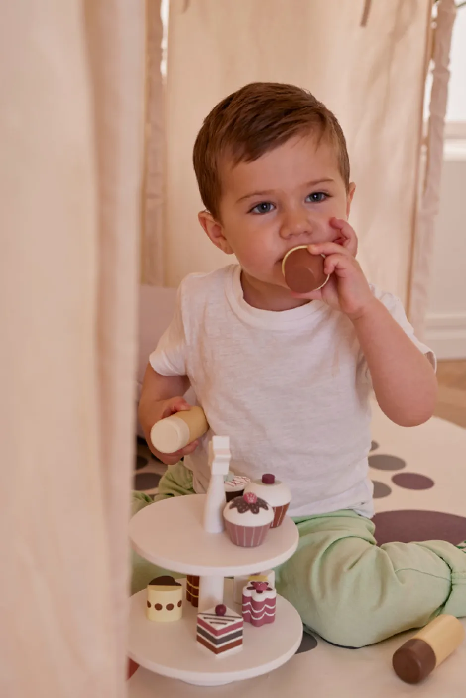 Lad dine små kokke arrangere deres favoritlegekager på dette smukt udformede kagefad og servere til deres venner eller yndlingsbamser. Med sin robuste konstruktion og glatte overflade er dette træ-kagefad både sikkert og sjovt at lege med. Skab uforglemmelige legestunder fyldt med fantasi og kreativitet med vores træ-kagefad til børn – det ideelle valg for enhver legekøkkenentusiast!