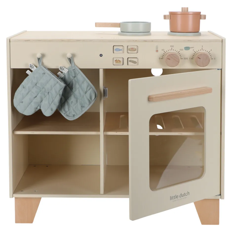 Opmærksomhed til små kokke! Dette smukke køkken i træ er perfekt til at tilberede de lækreste måltider. Bag en kage i ovnen, eller tilbered friske grøntsager på komfuret. Sættet indeholder to pander, en ovnhandske og en grydelap og er udstyret med trykknapper med illustrationer for ekstra realisme. Kombiner køkkenet med køleskabet eller sættet med vaskemaskine og opvaskemaskine for at skabe et komplet legekøkken. Hvad står der på menuen i dag?