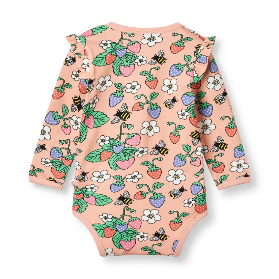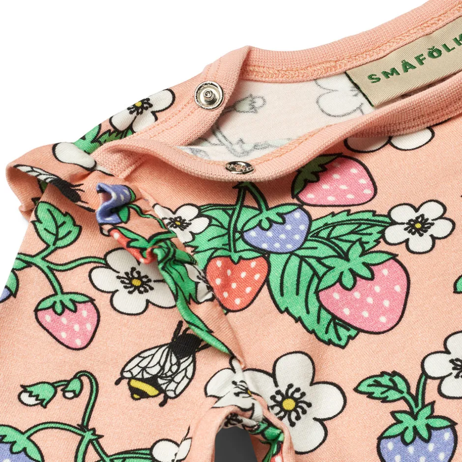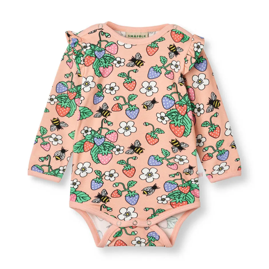 Langærmet baby body med jordbær produceret i en økologisk og strækbar bomuldsjersey. Denne body har en normal pasform med kuvertlukning og trykknapper, samt rib i halsen, på ærmerne og søde flæser på skuldrene.