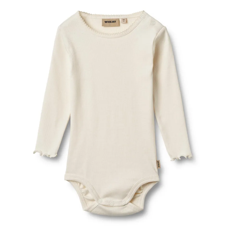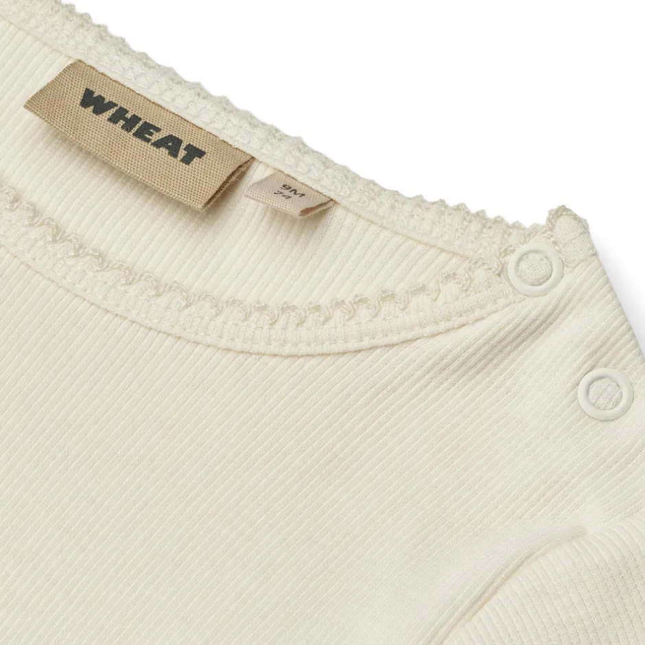 Wheats basis body er en sand klassiker i garderoben, når det kommer til småbørn. Denne body har trykknapper på den ene skulder samt i bunden for bedre komfort, når du skal klæde dit barn på. Brug bodyen som den inderste del i ethvert outfit, da den er blød at have tæt på huden. Man kan style bodyen afhængigt af vejr og årstid ved blandt andet at bruge den under en kjole, til et par matchende leggings eller på kølige dage med en sweater/strik udover.