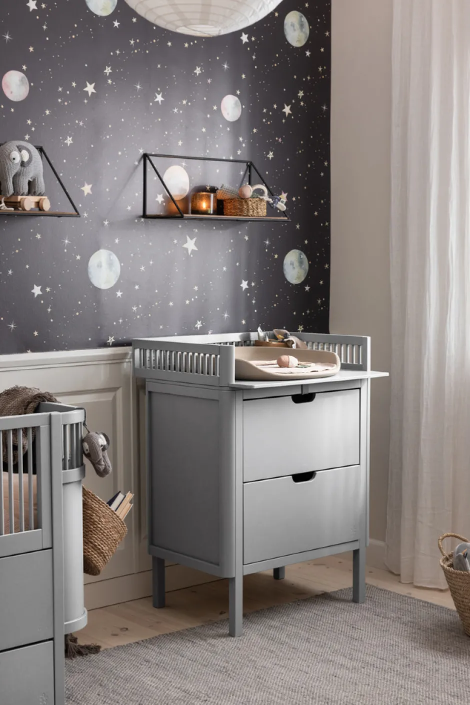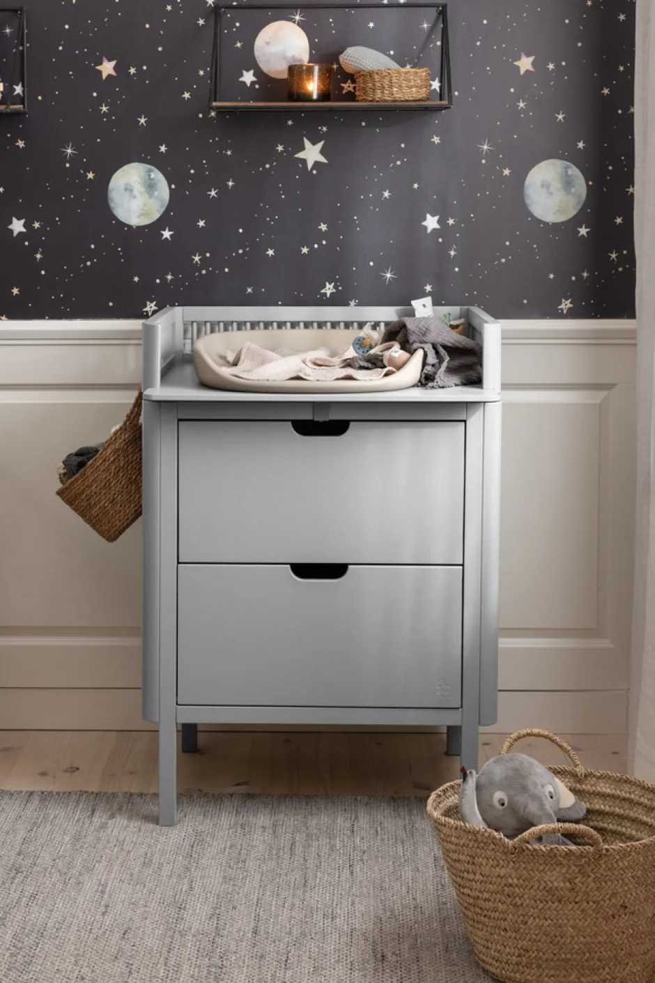 Sebra Puslebordet er et elegant, funktionelt og dansk-designet 2-i-1 møbel, som kommer med en kommode, en pusleplade og henholdsvis to skuffer. Puslebordet er designet med et skandinavisk og tidløst udtryk, der harmonerer med de øvrige møbler fra Sebra’s klassiske møbelkollektion. Et funktionelt, sikkert og klassisk puslebord uden uønsket kemi og med lang levetid til børneværelset, soveværelset, badeværelse eller et andet sted i hjemmet. Her ses Sebra Puslebordet med skuffer og i farven Classic White. Sebra Puslebordet med skuffer er et puslebord, der let kan forvandles til et klassisk opbevaringsmøbel, når behovet for puslebordet hører op. Puslepladen er lukket bagtil og til siderne og fremstår med en forhøjet kant med små runde tremmer, som er med til at give puslebordet det karakteristiske udtryk, som Sebra Sengen er så kendt og elsket for. Puslepladen (indvendige mål) har en dybde på 66 cm og en bredde på 69 cm, hvilket giver plads til en puslehynde og andre puslefornødenheder, som kræves i forbindelse med et bleskift, tøjskift eller blot en hyggestund med babypludder. De to skuffer giver mulighed for opbevaring at tøj, bleer, legetøj eller hvad der nu måtte være behov for. Skufferne er udstyret med ”softluk”, som sikrer, at skufferne lukkes stille og roligt. Derved minimeres risikoen for at få fingrene i klemme, og det er en god ting på netop børneværelset, hvor små fingre ikke altid er så hurtige, som de store. Den praktiske forvandling fra puslebord til opbevaringsmøbel sker ved, at puslepladen nemt fjernes fra underdelen. Denne egenskab gør, at det ikke er nødvendigt at opmagasinere et komplet puslebord eller skille sig af med puslebordet i perioden imellem blebørn – eller når behovet for et puslebord blot forsvinder helt. Det giver puslebordet en ekstra lang levetid og et produkt, der kan vokse med barnet eller dets søskende – et møbel, der let kan gå i arv. Fronterne fremstår med udskårne greb, der sammen med kommodens afrundede hjørner er med til at øge sikkerheden på børneværelset – ingen skarpe kanter, som kan give ridser og skrammer. Puslebordet er på fire ben, hvilket sikrer et lettere og mindre bastant udtryk end et puslebord uden ben. Det giver naturligvis også mulighed for opbevaring under kommoden, hvis behovet er der.