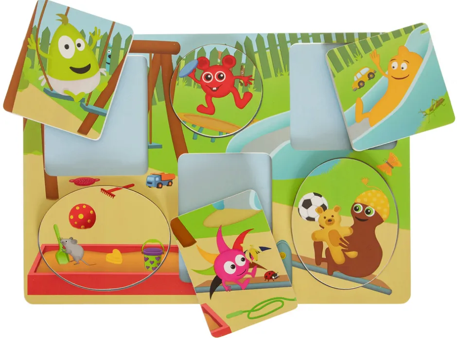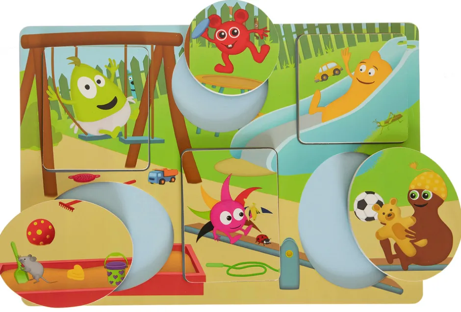Dette sjove og farverige puslespil har et motiv af de seks Babblarna-figurer: Babba, Bibbi, Bobbo, Dadda, Diddi og Doddo, som leger på en legeplads og inviterer børn til at lege udenfor som en naturlig del af dagen. Pædagogikken bag puslespillet er, at figurerne gemmer sig forskellige steder, og barnet skal finde dem, samtidig med at det lærer at genkende firkanter og cirkler. Puslespillet består af 6 brikker med motiver på begge sider, hvilket giver mulighed for at bygge det på mange forskellige måder.