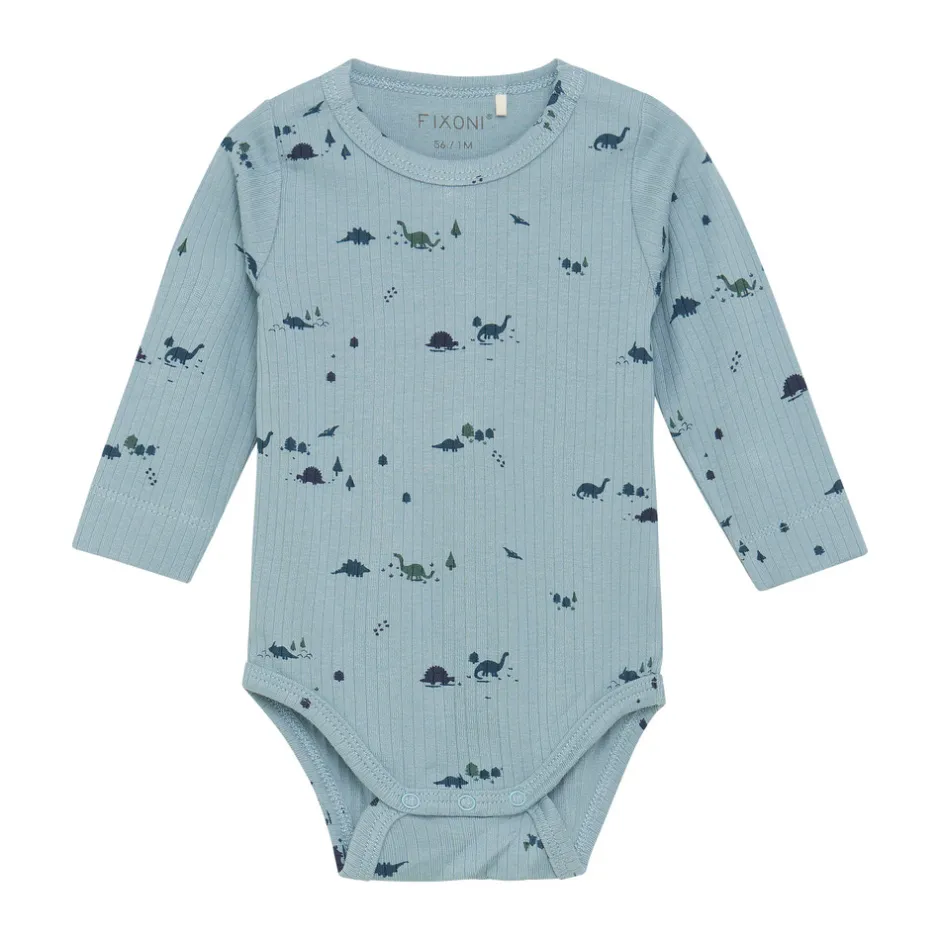 Body fra FIXONI med sødt all-over-print og blød ribstruktur. Bodyen er designet med praktiske trykknapper ved skulderen og mellem benene, som gør den nem at tage af og på. Den bløde ribkvalitet føles behagelig og skånsom mod barnets hud – perfekt til hverdagsbrug.