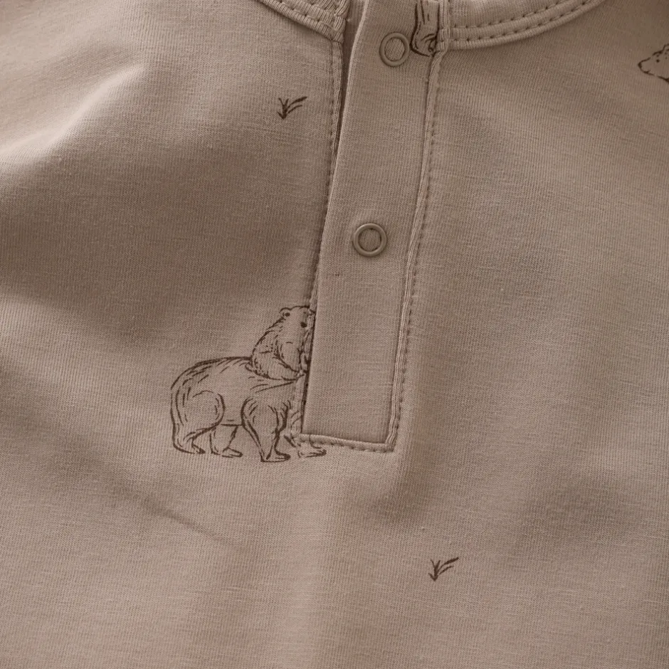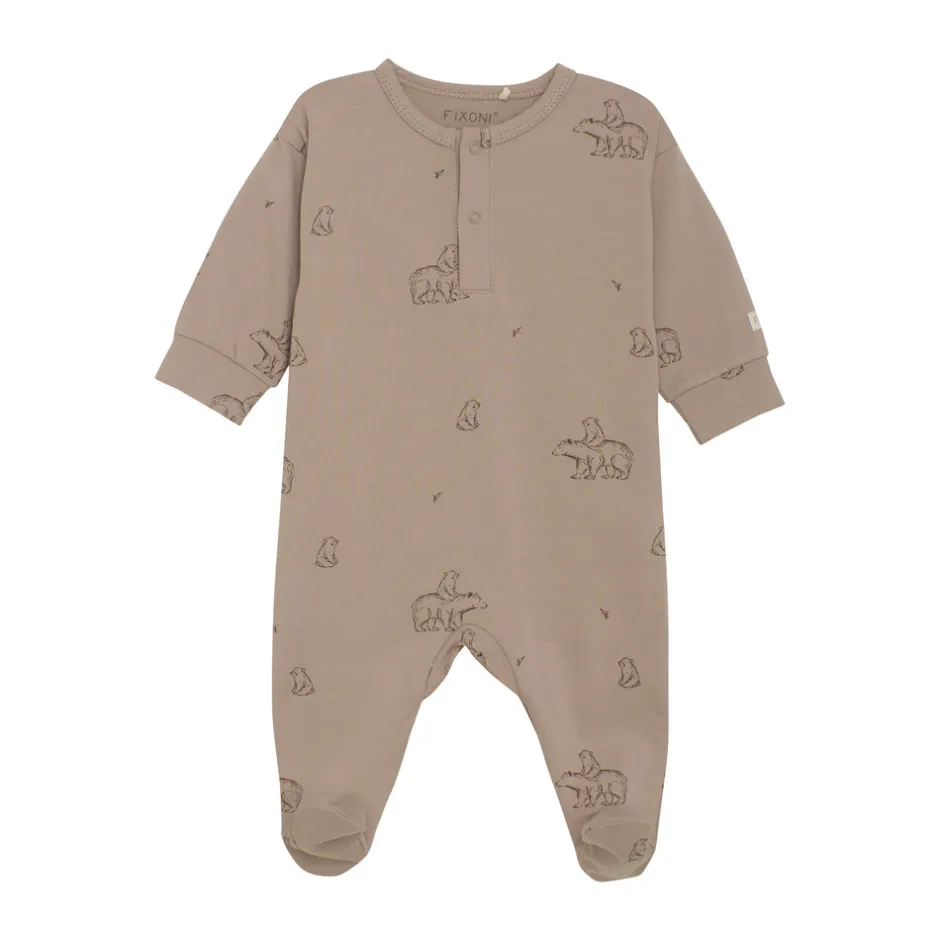 Heldragt med fødder og all-over-print fra FIXONI. Denne heldragt er designet med praktiske trykknapper foran og mellem benene, hvilket gør den nem at tage af og på – ideel til både hverdag og nattetid.