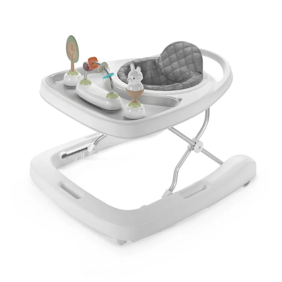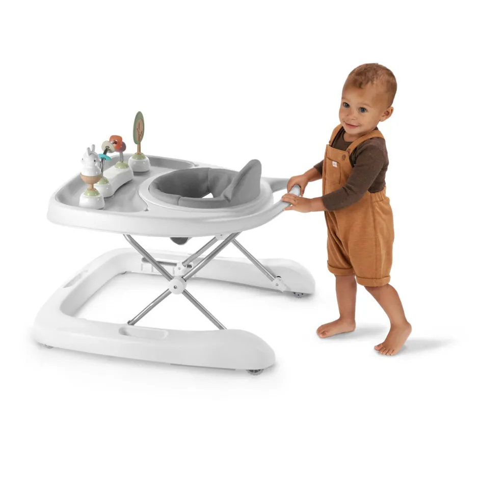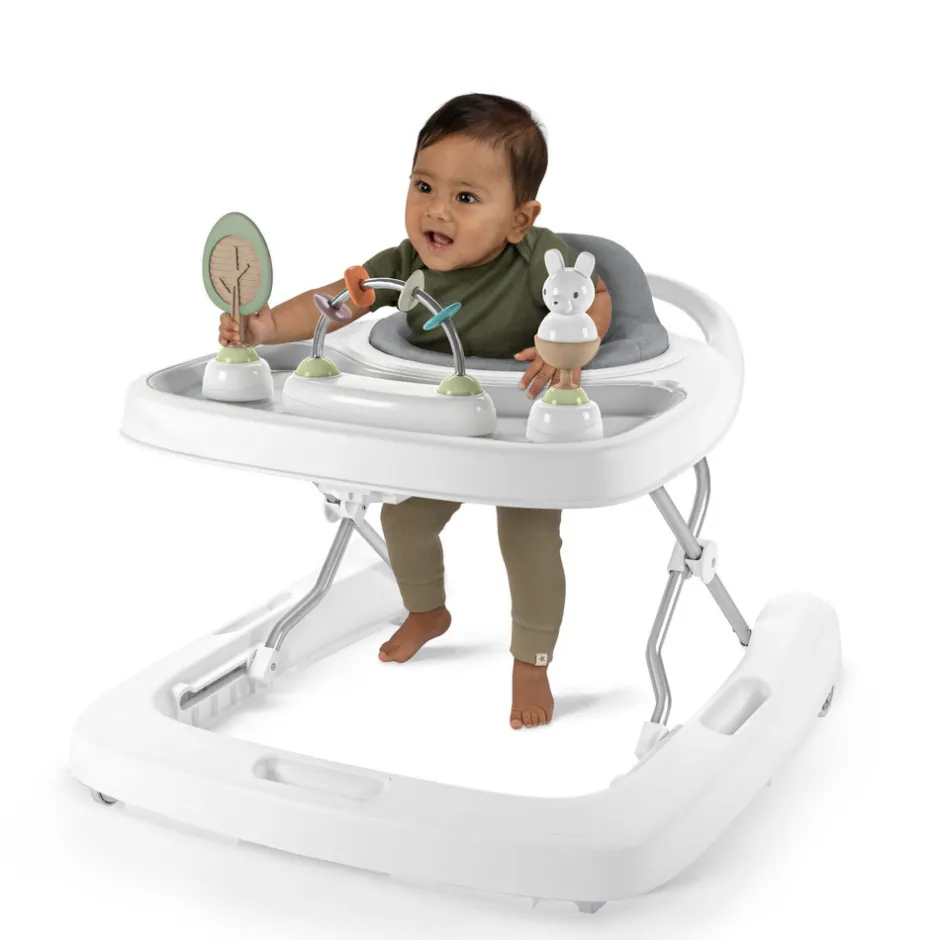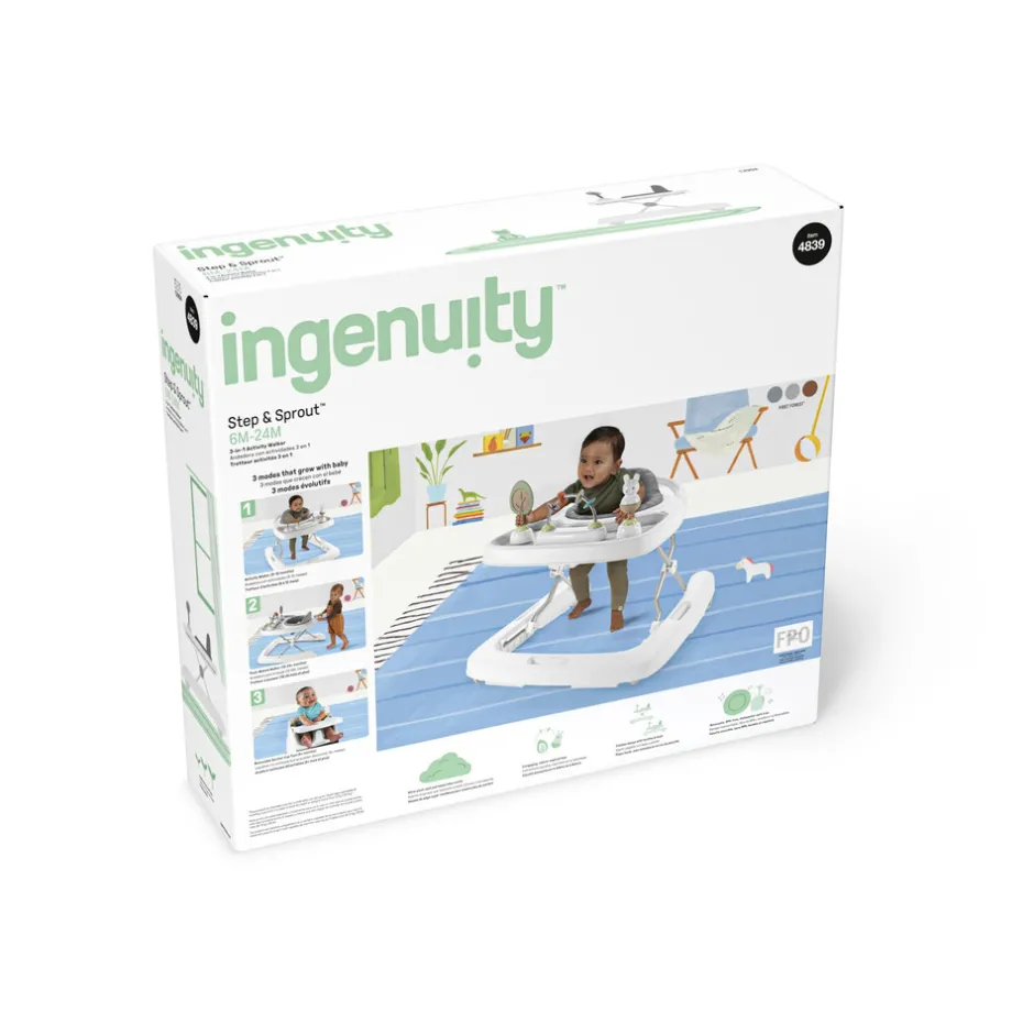 Verden ligger for babys fødder med Ingenuity Step & Sprout™ – First Forest™ 3-i-1 gåvognen. Små børn i alderen 6-24 måneder kan bevæge sig omkring og udforske temaet natur med aktiviteter i 3 forskellige tilstande, der vokser med baby. Gåvogns-tilstanden understøtter babys første skridt, mens skub-på-gåvogn-tilstand hjælper med at holde babyen stabil, mens den går. De 3 aftagelige naturinspirerede legetøj har sugekopper til fastgørelse på bakker eller borde. Gåvognen er nem at rengøre, og der medfølger en stor bakke med en aftagelig, BPA-fri bakkeindsats, der kan gå i opvaskemaskinen, mens både sædepude og legetøj kan tørres af. Den bløde sædepude får baby til at føle sig godt tilpas, mens den robuste ramme hjælper med at holde baby sikker. Efterhånden som dit barn vokser, har gåvognen 3 justerbare højdepositioner. Hvad enten du er på farten eller vil gemme gåvognen af vejen, så gør det foldbare design med bærehåndtag og lås det meget nemt.