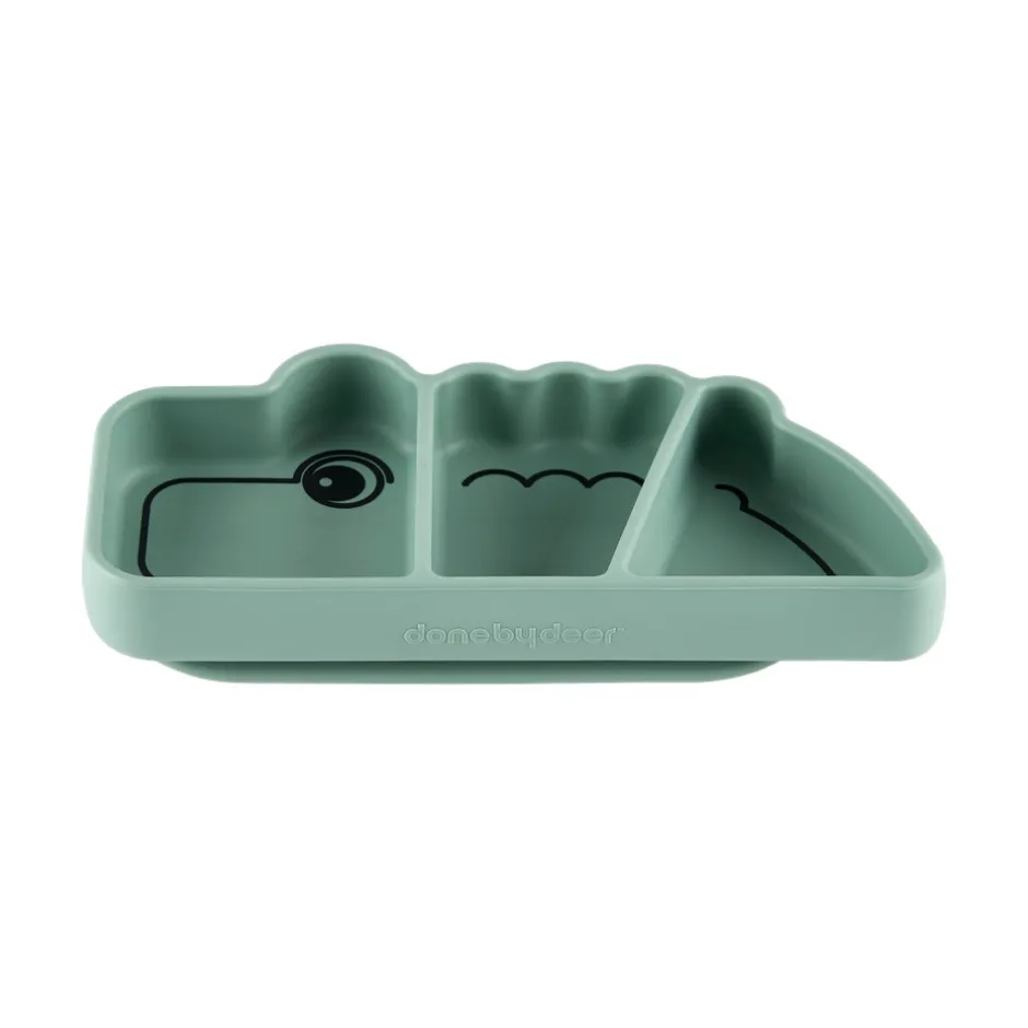 Gør mellemmåltiderne sjove med Croco snack tallerken. Den smarte stick & stay funktion sikrer, at tallerkenen står fast. De tre opdelte rum er perfekt til at adskille maden. Pres let på tallerkenen, så den suger sig fast til en glat overflade ved hjælp af naturligt vakuum, og forhindrer de små i at løfte eller tippe den. Hiv op i flappen under Croco’s hale for at ophæve suge funktionen.