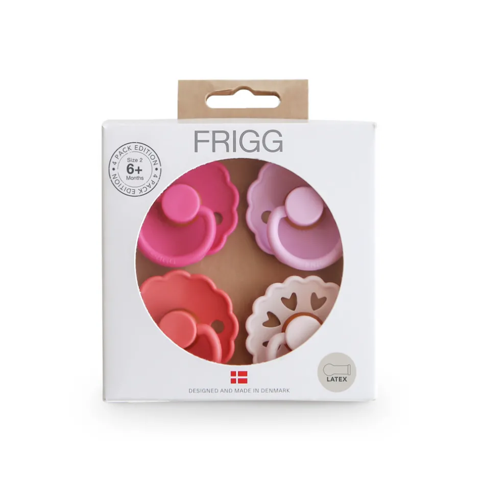 FRIGGs suttepakke ’Rosy Romance’ indeholder 4 forskellige sutter med en rund nippleform i latex str. 2. ’Rosy Romance’ er en pakke med sutter i sarte nuancer af pink og rød, der indfanger essensen af elegante blomster i en forårshave.