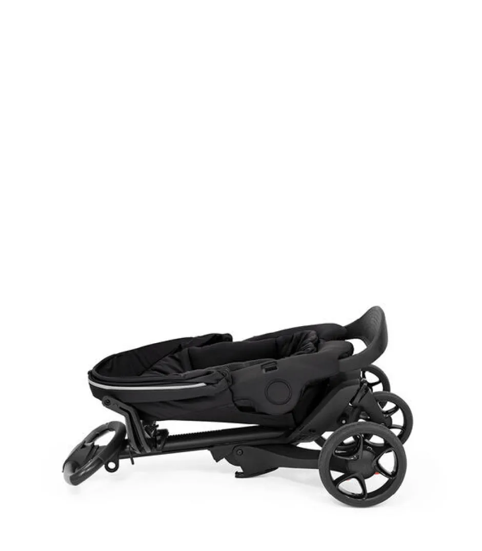 Stokke® Xplory® X er nem at manøvrere om det er by, natur eller skoven. Med de drejbare forhjul er den perfekt til en shoppetur, og hvis det er en skovtur kan de hjulene fastlåses, så uanset hvor turen går hen har du en vogn som er nem at have med. Alle hjul punkterfrie og lige til at klikke af, hvilket kan være en fordel hvis vognen skal med i mindre biler, eller hjulene blot trænger til at blive rengjort. Stellet er et fedt design hvor der er lagt vægt på komfort også for forældrene. Styret kan justeres i højden så den passer godt til alle højder, og der er godt plads mellem baghjulene så den vognen er nem at gå med uden man for ramt stellet. Den smarte og rummelige indkøbstaske medfølger, den er aftagelig og med et bærehåndtag. Når vognen foldes sammen bliver den godt kompakt og kan være i de fleste biler uden problemer, den er både praktisk og kompakt at opbevare.