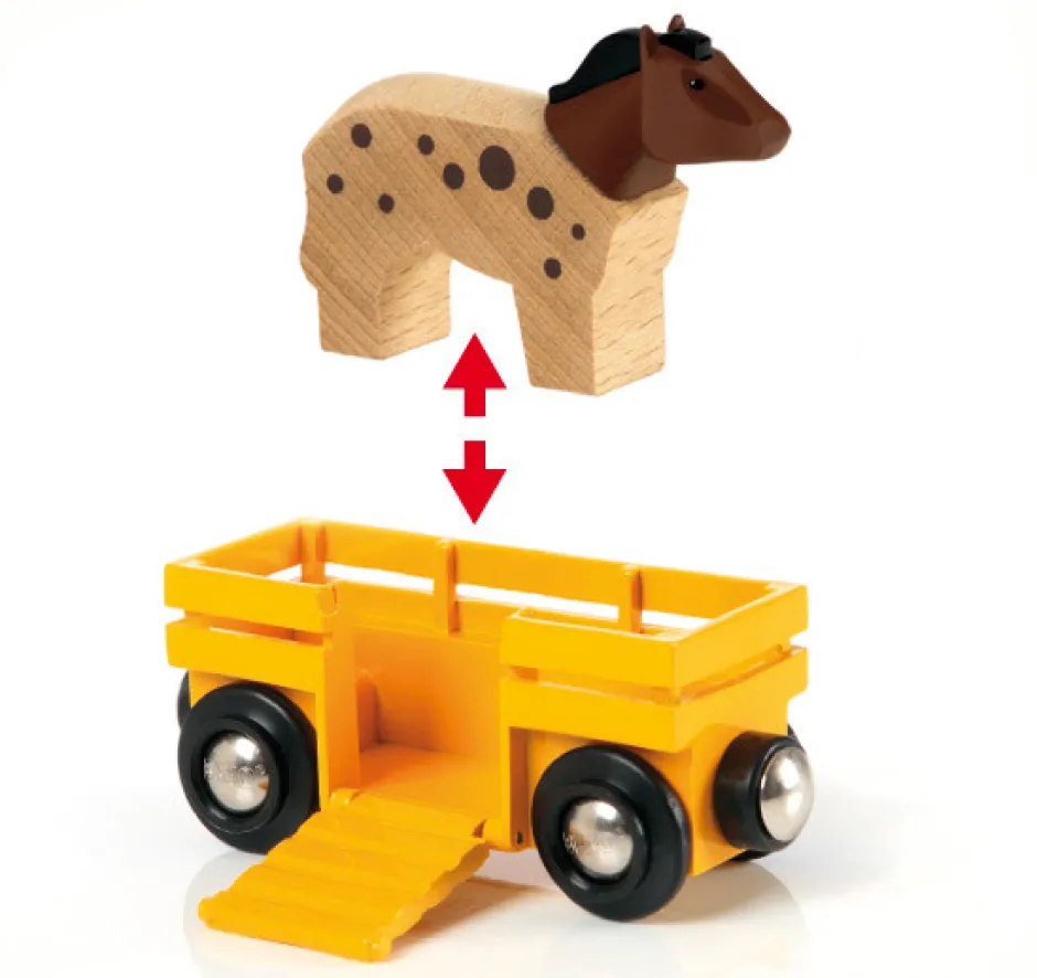 Hesten og koen skal transporteres ud til folden. Hjælp dem ombord på toget ved at folde rampen ned. Her er der ingen trængsel, da hvert dyr har sin egen vogn. Lad lokomotivet køre dem til endestationen. 1 Lokomotiv, 2 vogne, 1 hest og 1 ko. 5 dele. Fra 3 år.