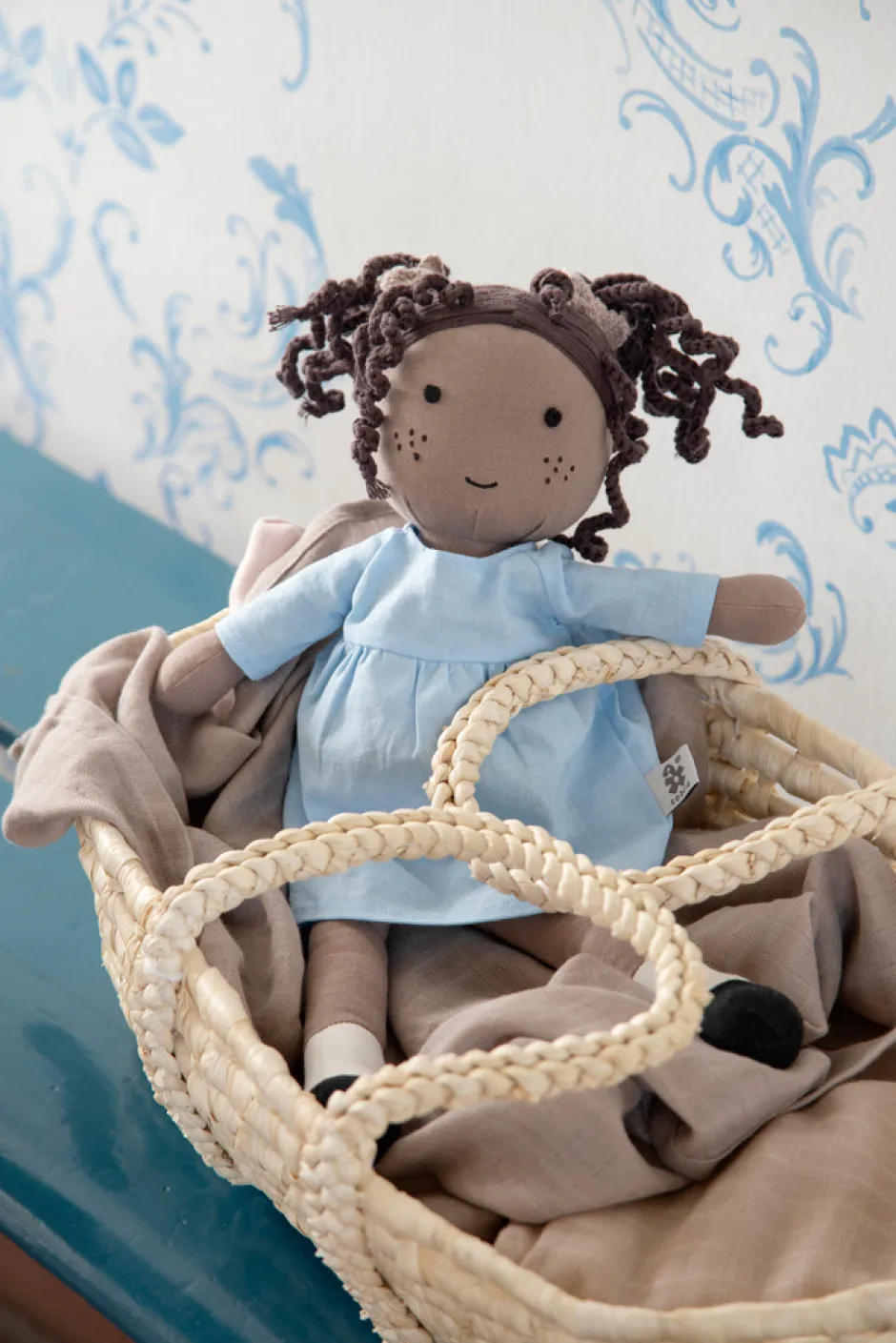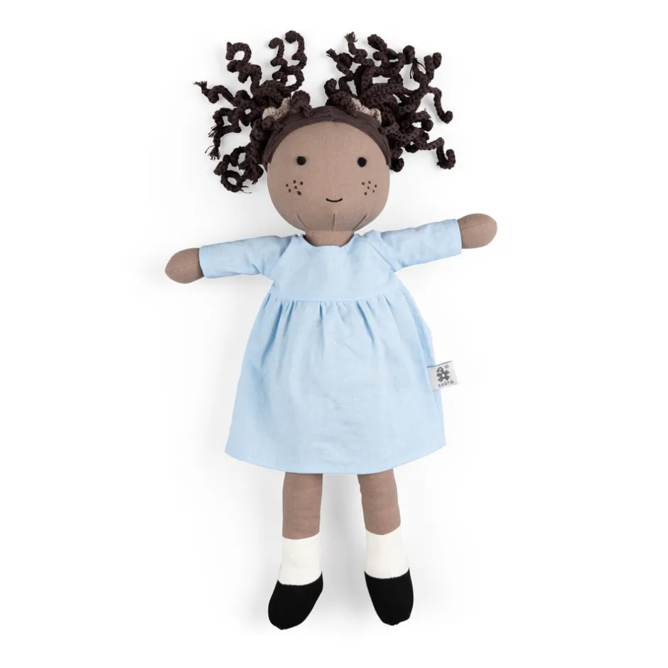 Poppy er en blød stofdukke, der vil vinde dit barns hjerte på ingen tid. Hendes krop og kjole er fremstillet af økologisk bomuld og hør, og hendes fine mørke hår er hæklet. Poppy måler 43 cm i længden og er fyldt med blødt genanvendt polyester.