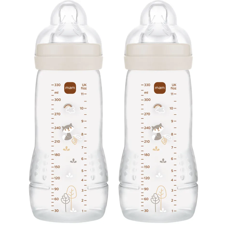 MAM Easy Active Baby Bottle 330ml 2pk Neutral er det perfekte valg til forældre, der ønsker en praktisk og komfortabel flaske til deres barn. Flaskerne har et ergonomisk design, der gør dem nemme at holde for både barn og voksen. Den bløde silikone-sut giver en naturlig følelse, som minder om amning, og den indbyggede anti-kolik funktion sikrer, at dit barn får en rolig og behagelig spisetid uden unødvendig luft i maven. Med en kapacitet på 330 ml er flaskerne ideelle til både mælk og vand, og det neutrale design passer ind i ethvert hjem. Flaskerne er nemme at rengøre og tåler opvaskemaskine, hvilket gør hverdagen lidt lettere.Specifikationer: