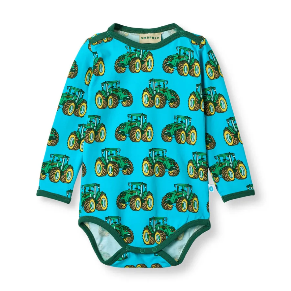 Langærmet baby body med traktor produceret i en økologisk og strækbar bomuldsjersey. Denne body er OEKO-TEX Standard 100® certificeret, hvilket betyder at denne body er produceret og testet for skadelige stoffer, så du kan passe på dit barns hud og helbred.Denne body har en normal pasform med kuvertlukning og trykknapper, samt ribkant i hals og ærmer. Småfolks body’er er designet i Danmark med tanke på at kunne holde til utallige eventyrer og leg, og bevare form og farver selv efter gentagen brug.