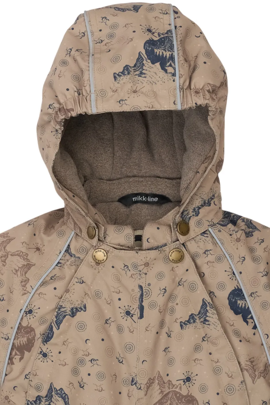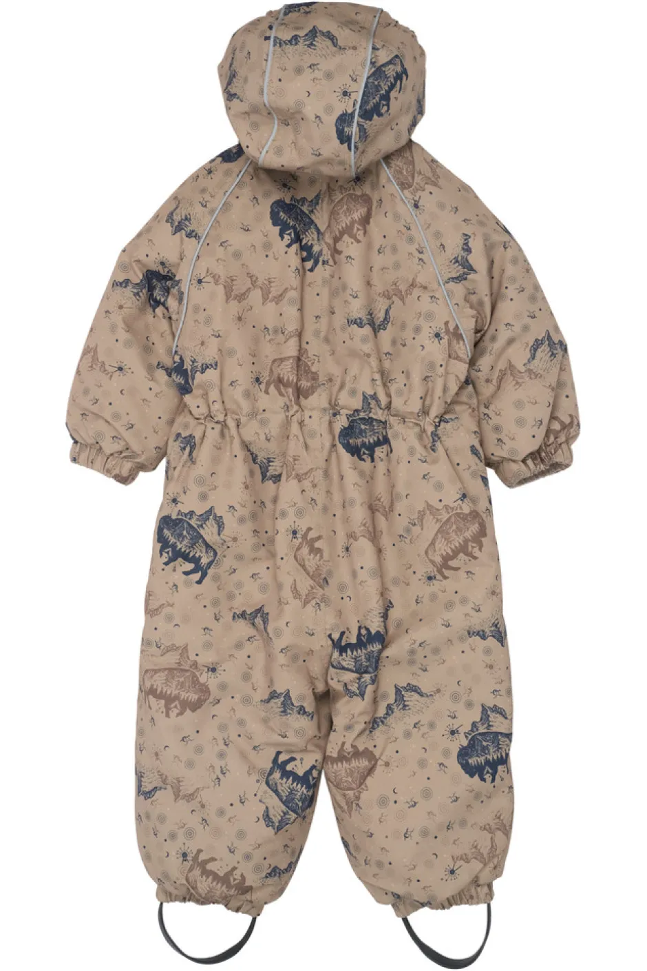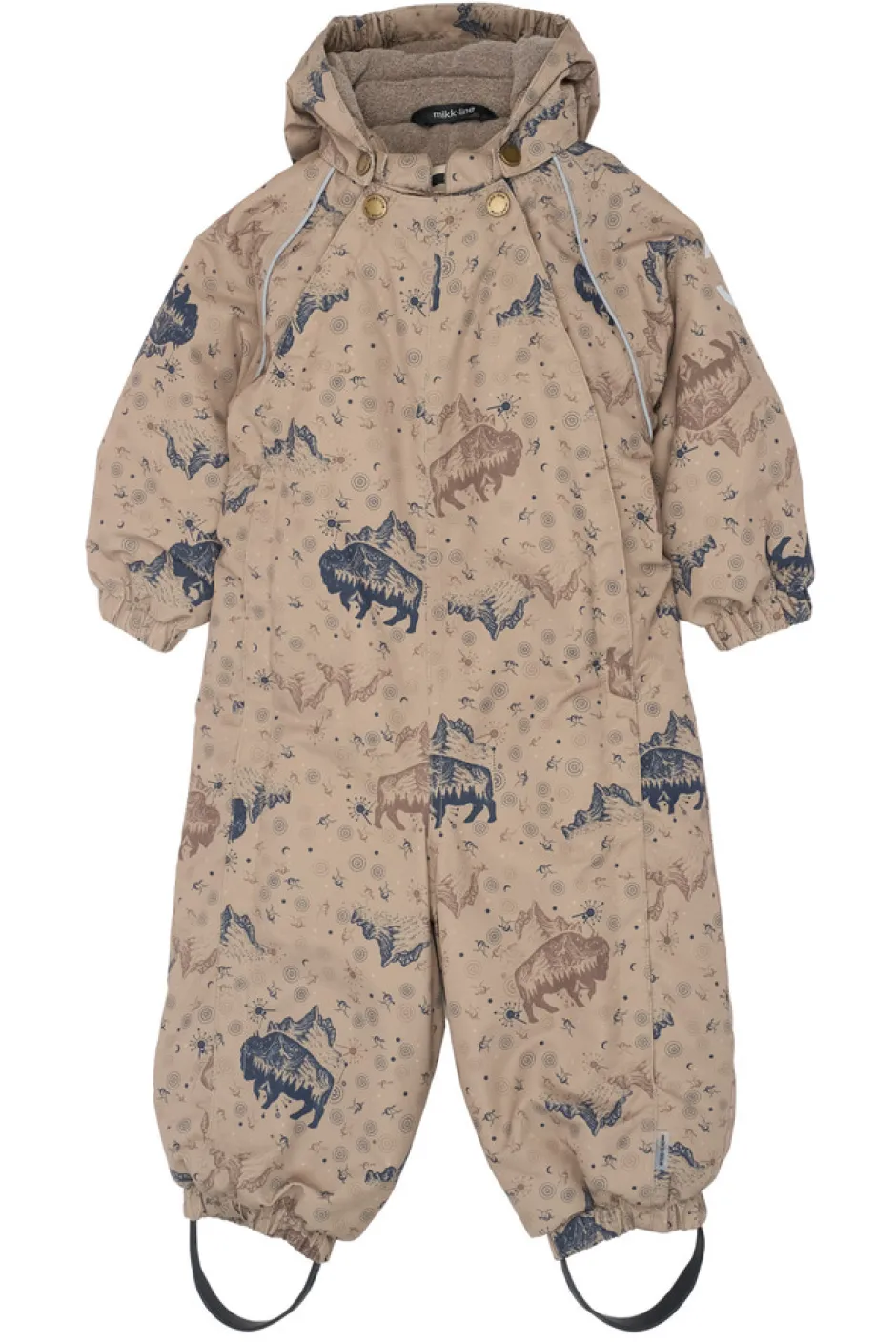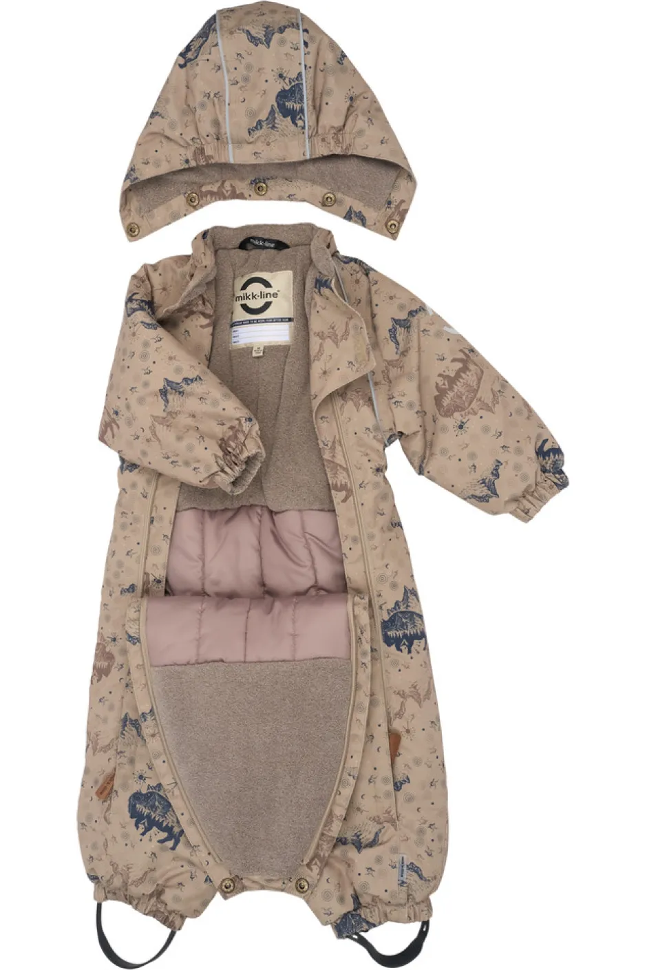 Mikk-line baby flyverdragt med et sejt print af vinterlandskab og skovens dyr. I denne lækre flyverdragt kan barnet lege og udforske naturen under den åbne himmel i alt slags vejr i løbet af de kolde og våde efterår- og vintermåneder. Flyverdragten er lavet af genanvendt polyester og polstret med polyesterfyld. Hætten og overkroppen har blødt fleece foer, hvorimod ærmerne og benene har en glat og gnidningsfri indvendig overflade. Vi har anvendt Solution Dye til farvning af det glatte for, da det bl.a. mindsker forbruget af vand i produktionen. Den er naturligvis også fluorfri med BIONIC-FINISH® ECO imprægnering.