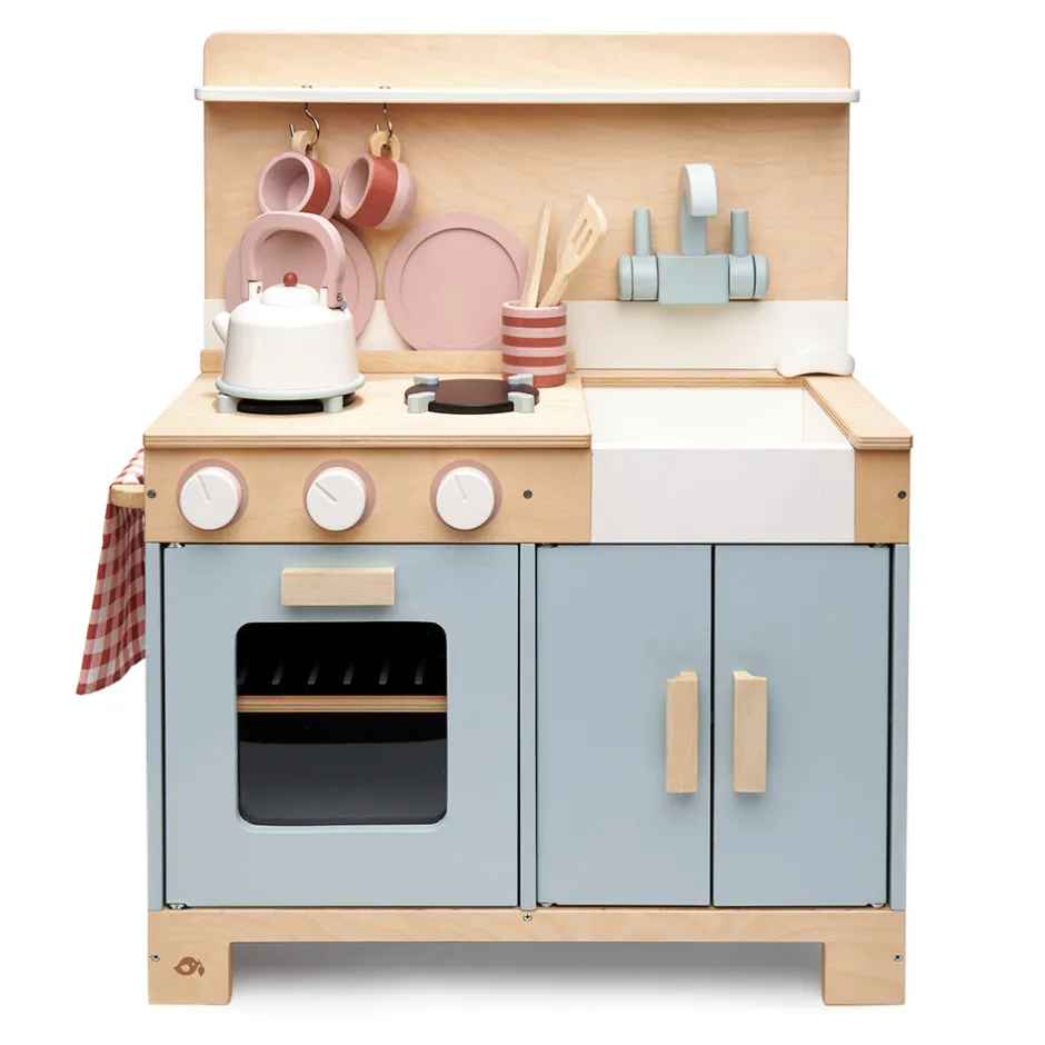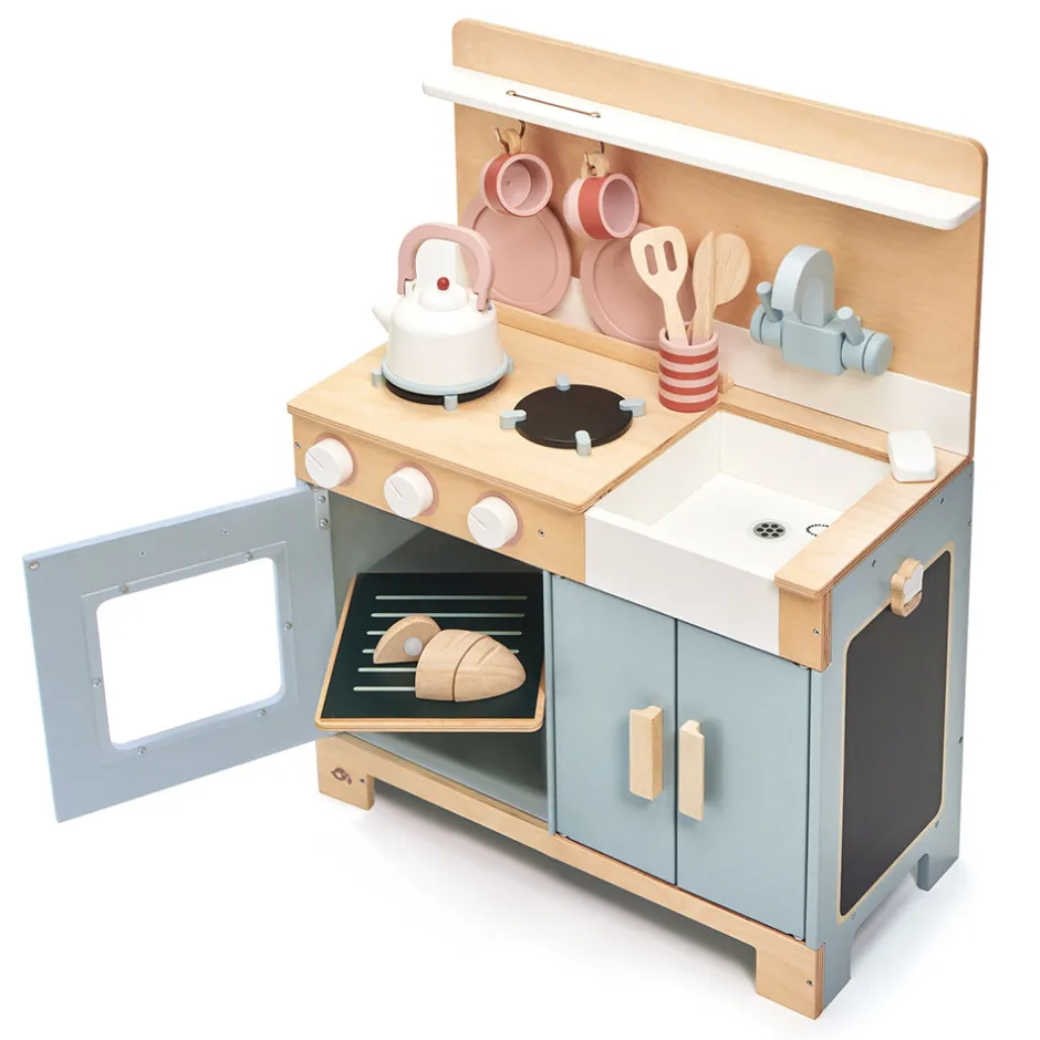 Et stilfuldt og moderne legekøkken med ovn, 2 gasblus, køkkenvask med vandhane og indbygget skab med låger.