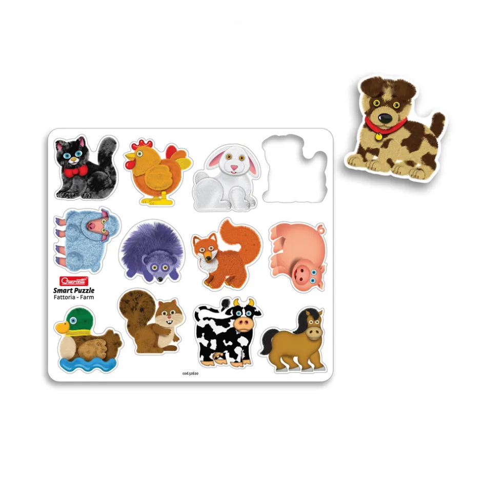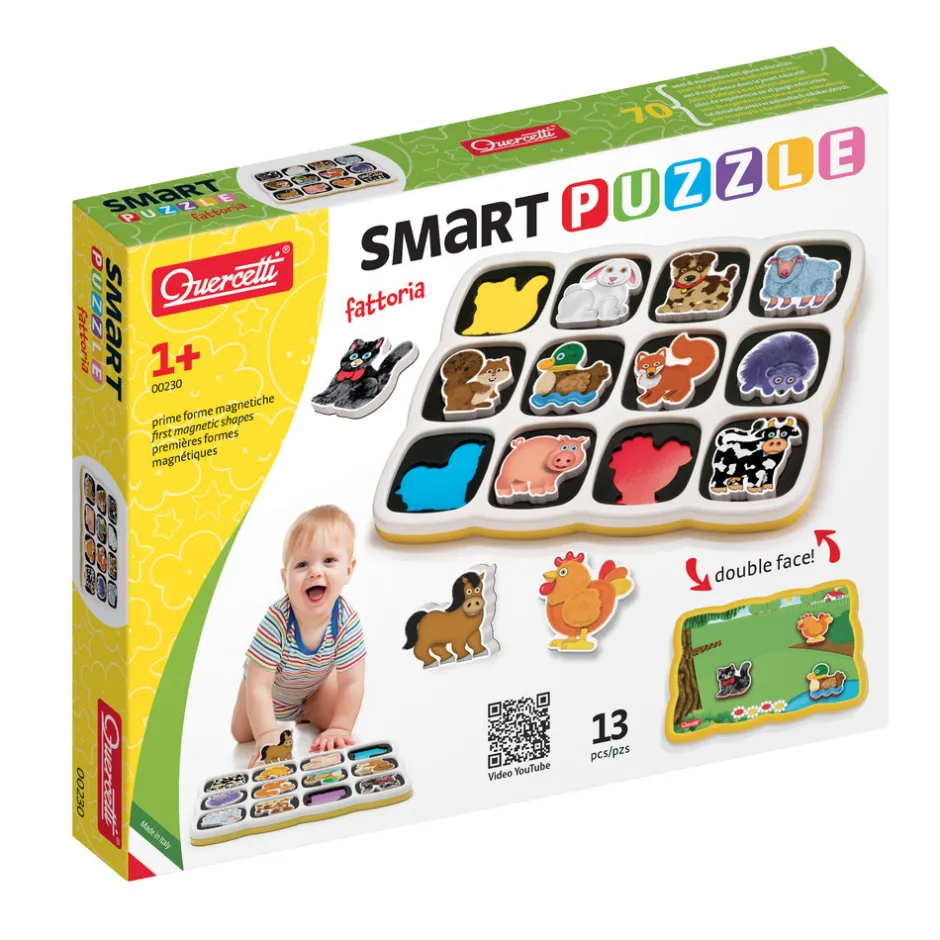Quercettis magnetiske puslespil med den dobbeltsidede pusleplade træner børnenes finmotorik og introducerer dem til de mest elskede bondegårdsdyr.