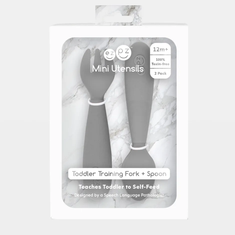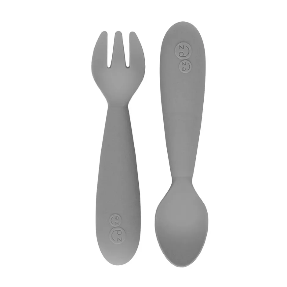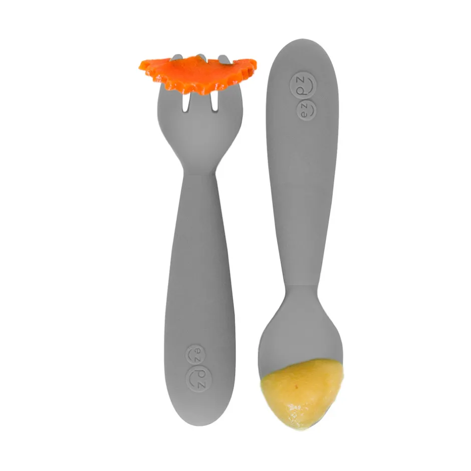 EZPZ Bestiksæt hjælper baby med at spise selv. At lære at spise selv, er et vigtig udviklingstrin for baby. Bestikket er designet til at passe det lille barns mund og hænder. Lille bue i bestikket gør det nemmere for baby at lukke læberne korrekt om det. Non-slip silikonegreb og det korte, afrundede skaft, gør det nemmere at styre bestikket for barnet. Sikker til brug med kolde og varme væsker og fødevarer.