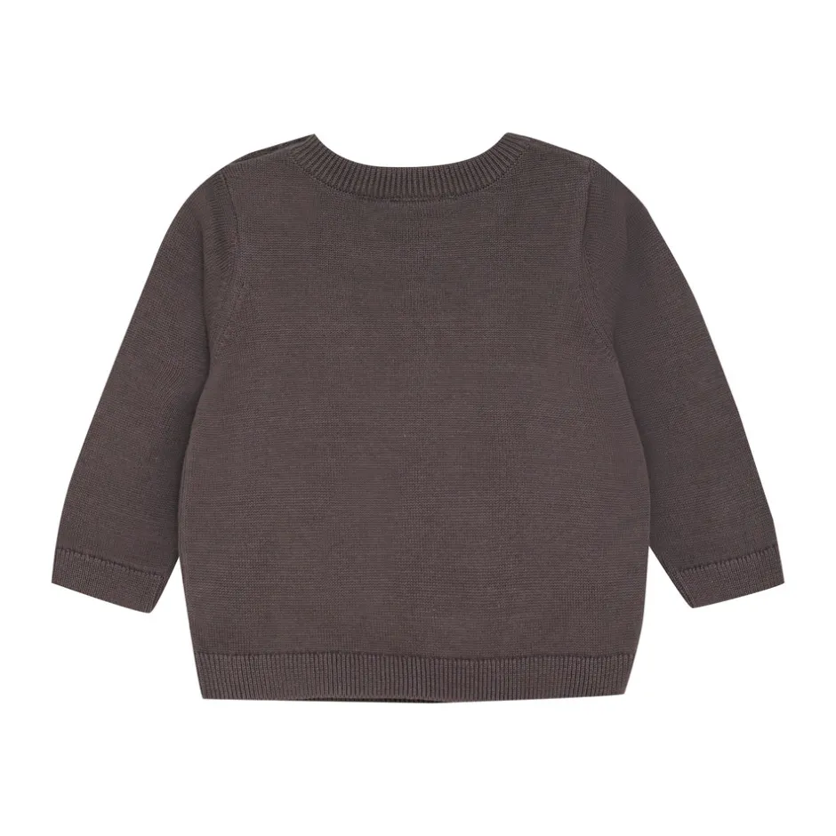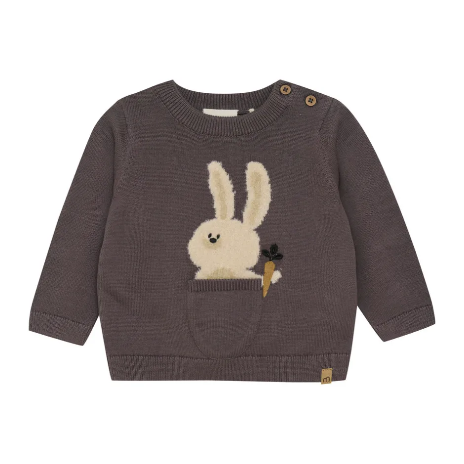 Strikket trøje med sød kanindetalje fra Minymo. Denne fine trøje har en dekorativ lomme foran, hvor en lille kanin ser ud til at titte nysgerrigt frem – en charmerende detalje, der vækker smil. Trøjen er designet med knapper på skulderen og ribkanter ved ærmer og bund, som sikrer en behagelig pasform og et flot finish.