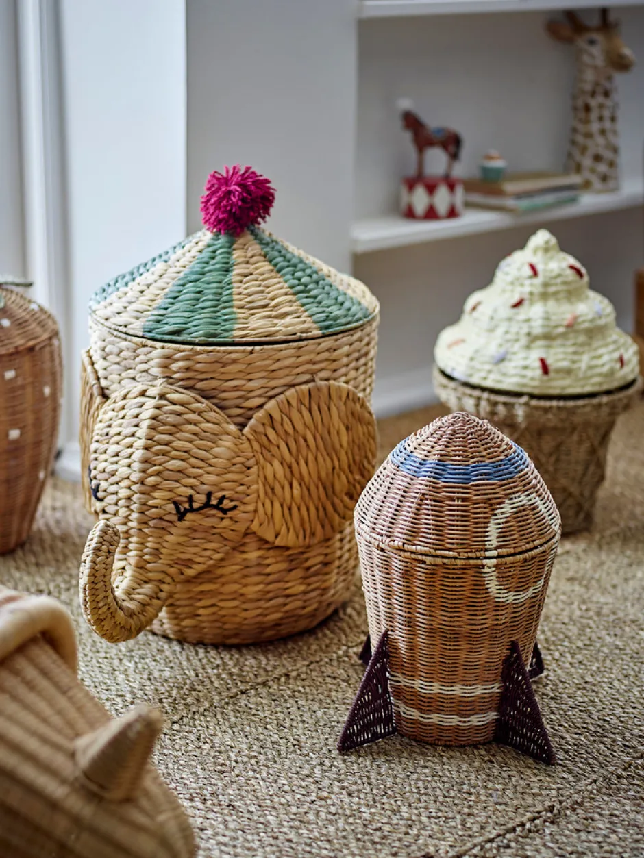 Space Kurven med låg fra Bloomingville MINI er flettet i rattan og har form som en raket med fine detaljer. Den sjove form gør opbevaring af legetøj til en leg og tilføjer personlighed til rummet.