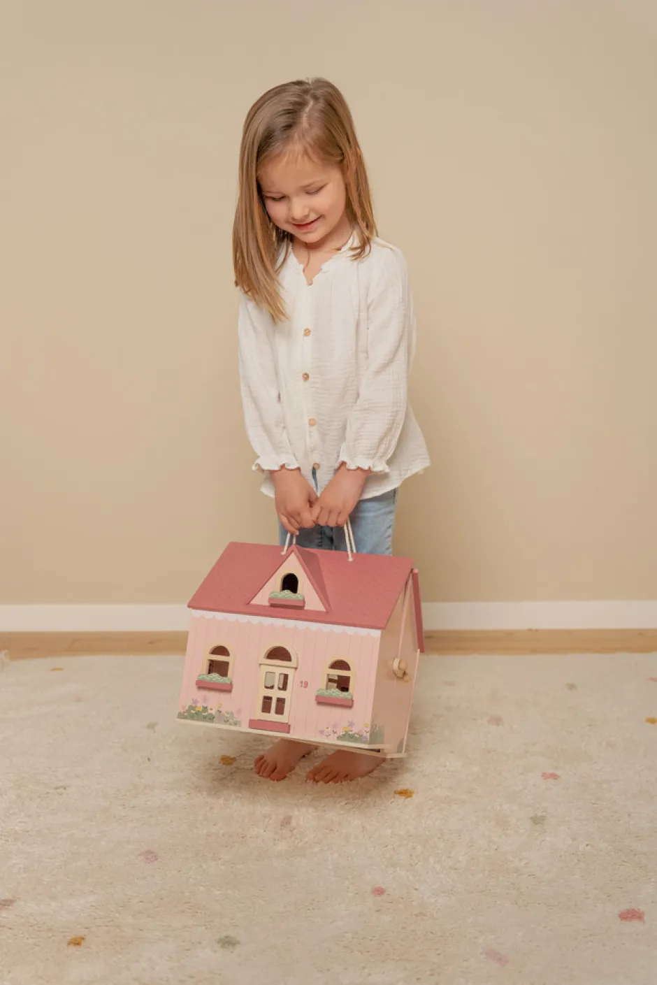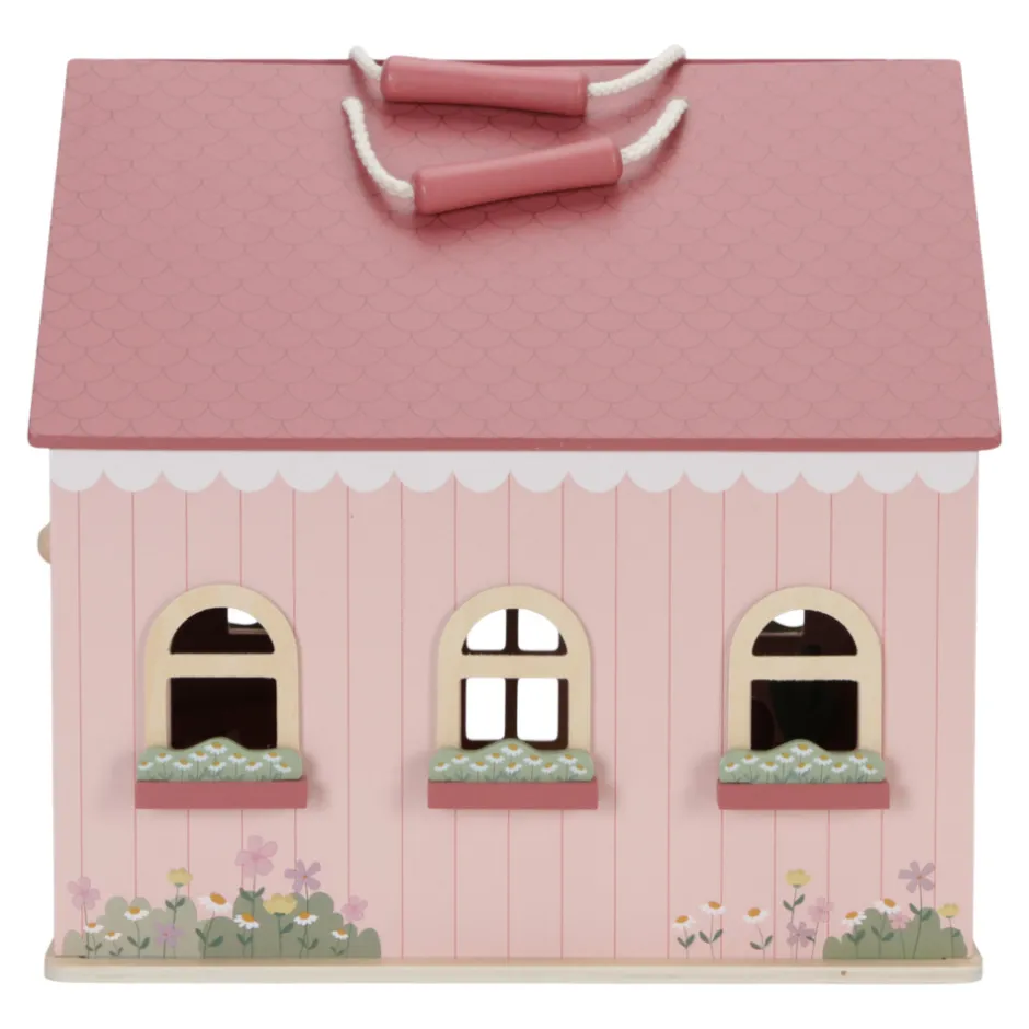 Det transportable dukkehus i træ fra Little Dutch er et sødt og hyggeligt lyserødt hus med smukke detaljer. Huset har en stue og et køkken nedenunder og et soveværelse og badeværelse ovenpå. Med trælukningen kan dukkehuset nemt åbnes og lukkes, og takket være håndtaget er det nemt at tage med overalt. Møblerne er inkluderet, men der findes også ekstra udvidelsessæt til at dekorere huset yderligere. Dette dukkehus er perfekt til børn, der elsker at lege og forestille sig deres egen lille verden. ADVARSEL: Ikke egnet til børn under 3 år på grund af små dele. Fare for kvælning