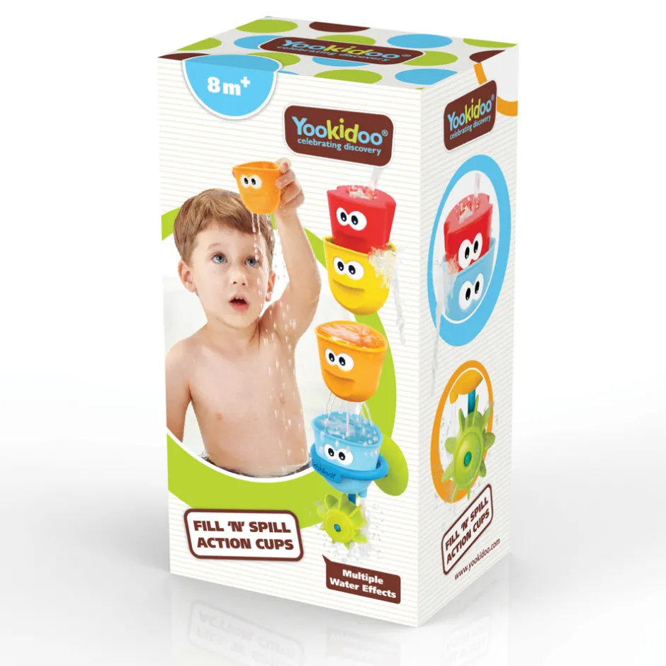 De små kopper har forskellige vandeffekter, som barnet kan more sig med at undersøge. De kan sættes i den medfølgende holder og hælde vand over tandhjulet. Holderen kan bruges til opbevaring af kopperne samt til at stable kopperne for at lege med dem og se de forskellige vandeffekter.