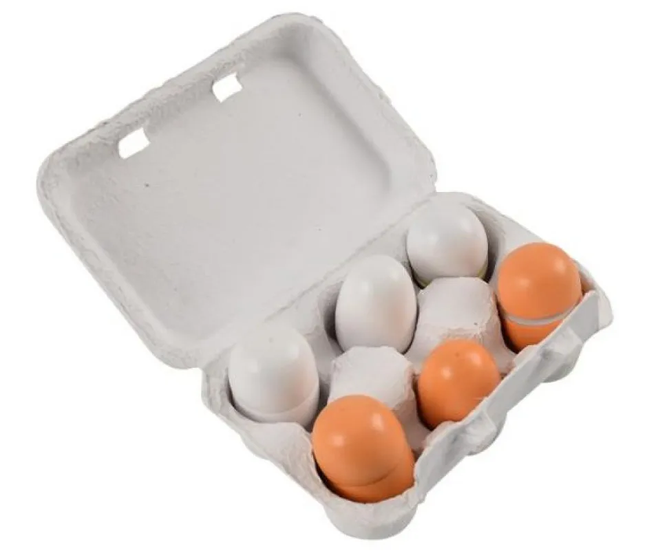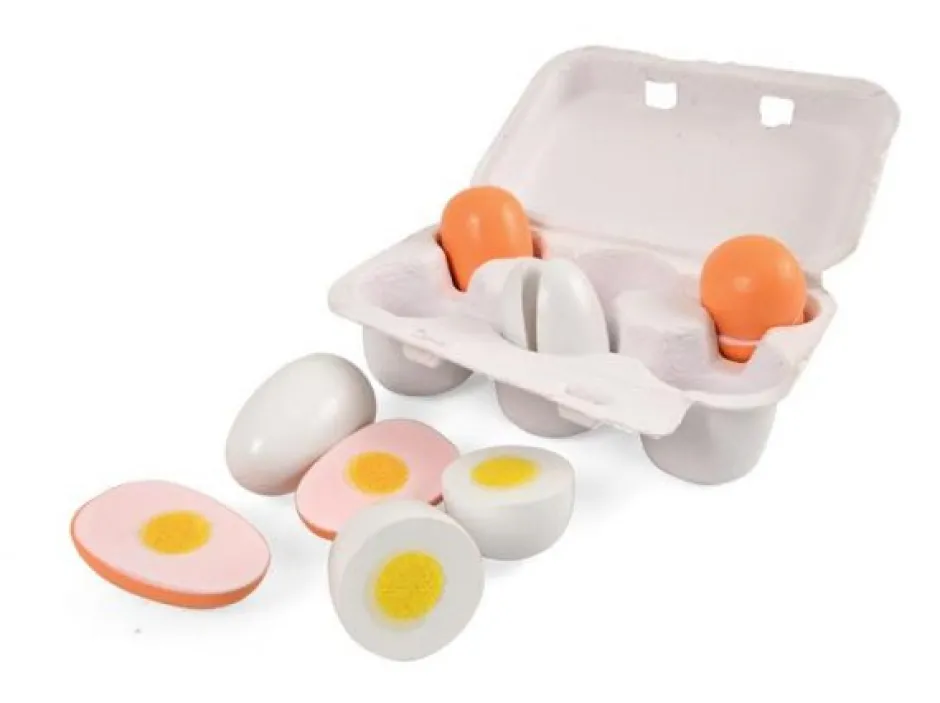 En æggebakke med 6 æg i træ. 2 hele æg og 4 halve æg med velcro, så æggene kan skæres over og samles igen. Et must have i børnenes køkken! Høj kvalitet og helt fri for skadelige stoffer og naturligvis malet med giftfri maling.