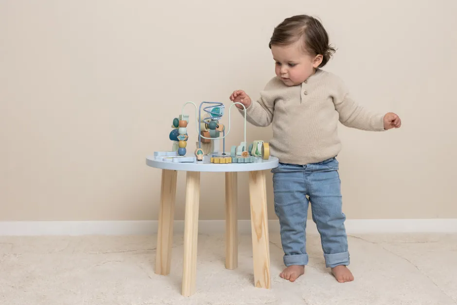 Stå op og leg! Opdag alle de aktiviteter dette bord har at byde på. Flyt perlerne fra den ene side til den anden på spiralstangen, byg et tårn, læg puslespillet eller drej på hjulene og flyt de små dyr fra Forest Garden kollektionen. Dette træaktivitetsbord udfordrer dit barn på mange måder. Der er 5 aktiviteter at udforske, hver især støtter udviklingen af finmotoriske færdigheder. Takket være det sikre og velafbalancerede design opmuntrer aktivitetsbordet også barnet til at stå op og bliver stående! Voksenmontering er påkrævet.