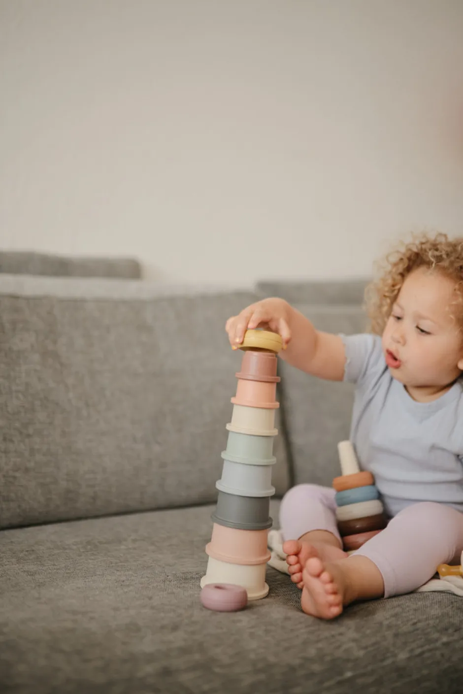 Når stablekopperne stables ovenpå hinanden til et tårn, fremstår det super flot og elegant. Dem, der kender Mushies produkter, genkender straks stilen, kvaliteten og farverne, som kendetegner Mushie.