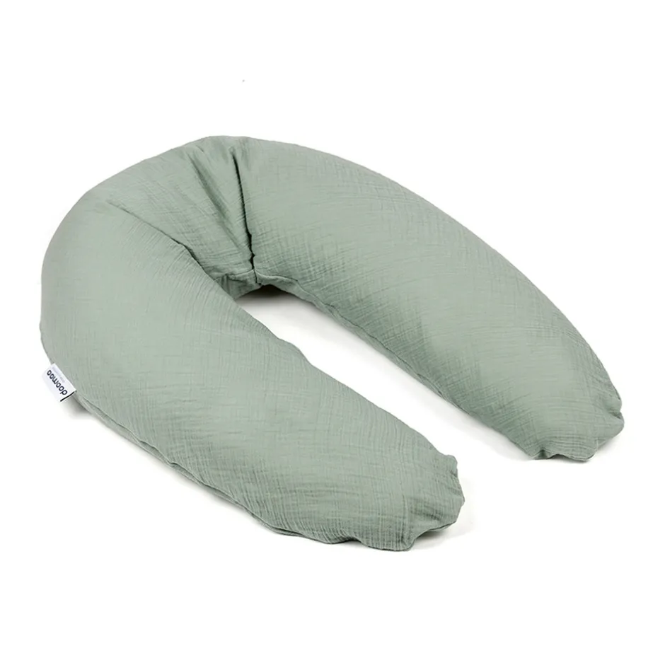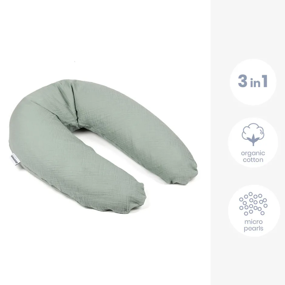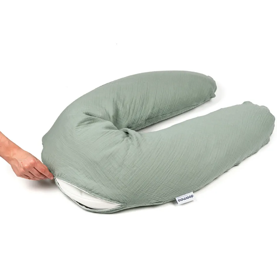 Doomoo kombineret ammepude og graviditetspude Muslin er en stor, blød og ergonomisk boomerangformet pude. Den er fyldt med minimale og raslefri EPS-kugler, der gør den formbar og giver optimal støtte til lille og stor mor og den voksende baby. Under graviditeten giver puden støtte og aflastning, og en mere behagelig sidde- eller liggende stilling. Puden ligger fast mellem ben og hoved. Puden støtter maven og aflaster trykket, når bækkenbunden løsner sig. Som ammepude fungerer puden optimalt med sine minimale EPS-kugler. De sikrer, at puden bevarer sin fasthed og form under hele amningen, og ikke “hænger”. På den måde får barnet den optimale amme stilling og mister ikke grebet om brystvorten, samtidig med at moderen får god aflastning for sine skuldre, nakke og ryg. Graviditets- og ammepude Muslin har flere smarte funktioner. Den kan også bruges som en behagelig liggestøtte til barnet, både når det ligger på maven og på ryggen, og som en sikker siddestøtte, som en “lære at sidde hynde”. Den fungerer også fantastisk som læsepude til både børn og voksne.