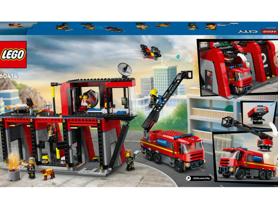 Bliv en del af mandskabet på LEGO® Citys sejeste brandstation 60414. Planlæg redningsmissioner i det moderne kontrolcenter på øverste etage. Tag brandmandsstangen til udstyrsområdet og brandbilsrum 1 og 2. Monter stigen eller 360°-ildslukkeren bag på brandbilen. Start derefter den fjernstyrede drone fra helikopterlandingspladsen, tag din trofaste brandhund med, og drag ud på endnu et actionfyldt brandslukningseventyr!