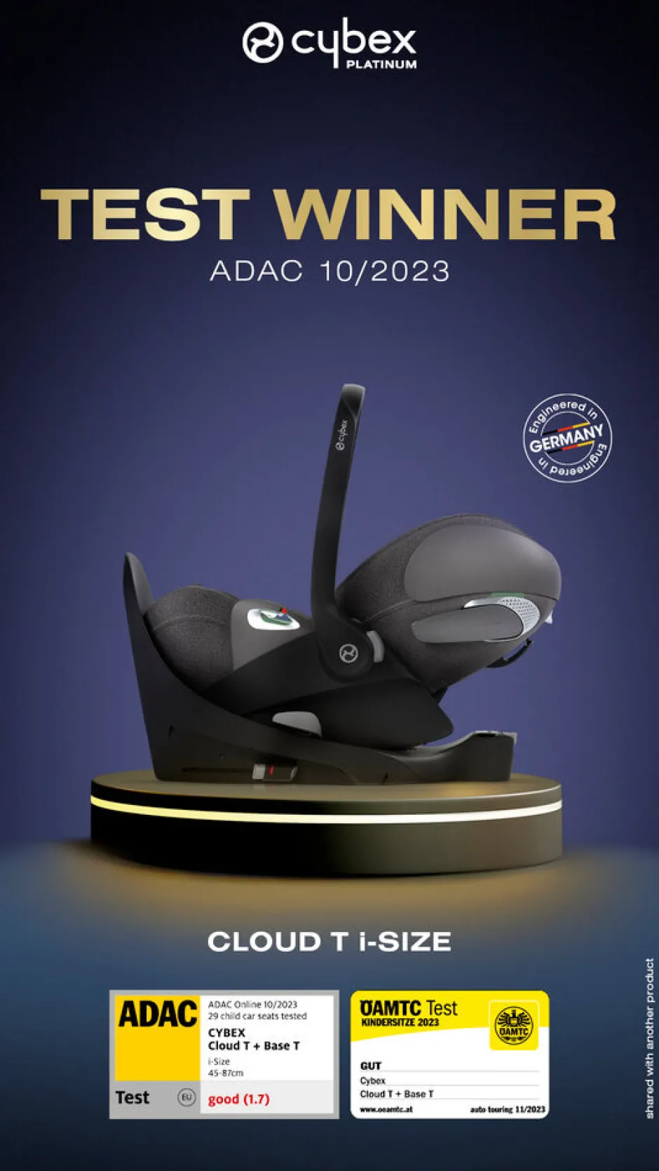 Cloud T i-Size (med Base T – tilkøb) er blevet kåret testvinder 2023, delt med et andet produkt, af den tyske bilorganisation, ADAC og Stiftung Warentest. Med et samlet resultat på 1,7 og et ekstraordinært sikkerhedsresultat på 1,3, gør det den til den perfekte følgesvend fra fødsel til ca. 24 mdr. Med den ergonomiske hvilefunktion på basen (eller full lie-flat når den bruges på klapvognsstellet), samt stoffet/materialet på stolen der altså er 6 gange så åndbar, sikrer din baby en komfortabel og behagelig rejse hvor end turen går hen.