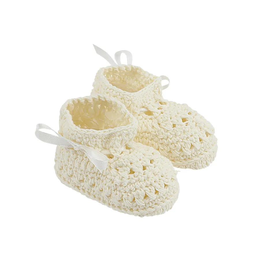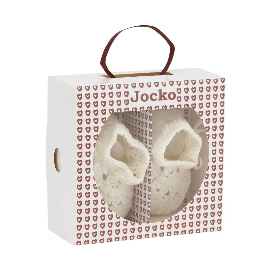 Søde hæklede sko i 100% bomuld fra Jocko . Skoene har et lille justerbart satinbånd med sløjfe om ankelen. Fås i hvid og creme i både 10cm og 11cm . Leveres i en lille fin æske med hank.
