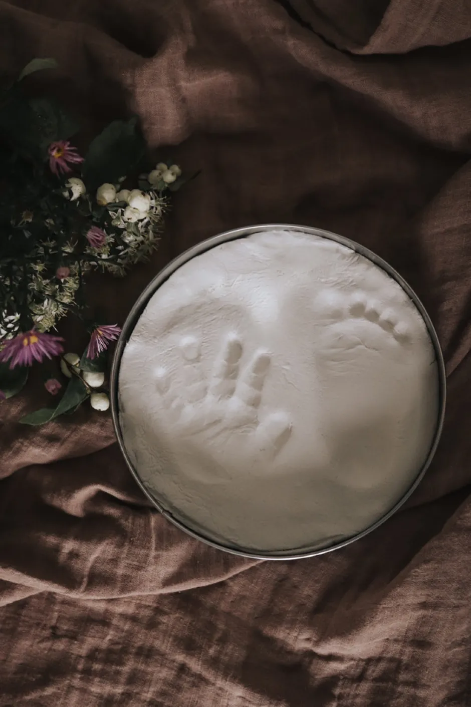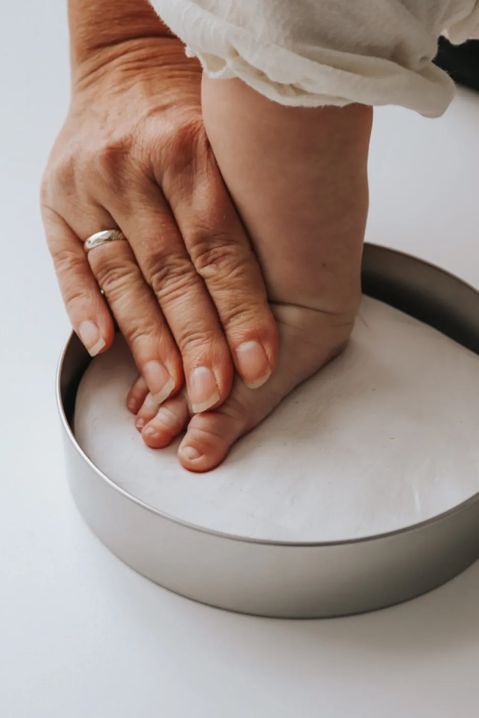 Instruktioner: Hold posen lukket indtil brug. Blødgør leret ved at ælte det i to-tre minutter, eller indtil det er blødt og alle luftbobler er væk. For at undgå at leret klistrer til overfladen anbefales det at anbringe det på plastikfilmen fra posen. Rul leret ud med trærullen til en tykkelse der passer til tinæsken. Tryk forsigtigt barnets hånd eller fod ned i leret og lav et aftryk. Når aftrykket er lavet, skal det overskydende ler skæres væk så aftrykket passer til tinæsken. Anbring ler-aftrykket i boksen og lad det lufttørre på en flad overflade. Lad aftrykket tørre i 2 dage på et køligt sted. Når leret er tørt, kan tinæsken placeres i akrylfoden eller bare i tinæsken til minde om det særlige øjeblik.