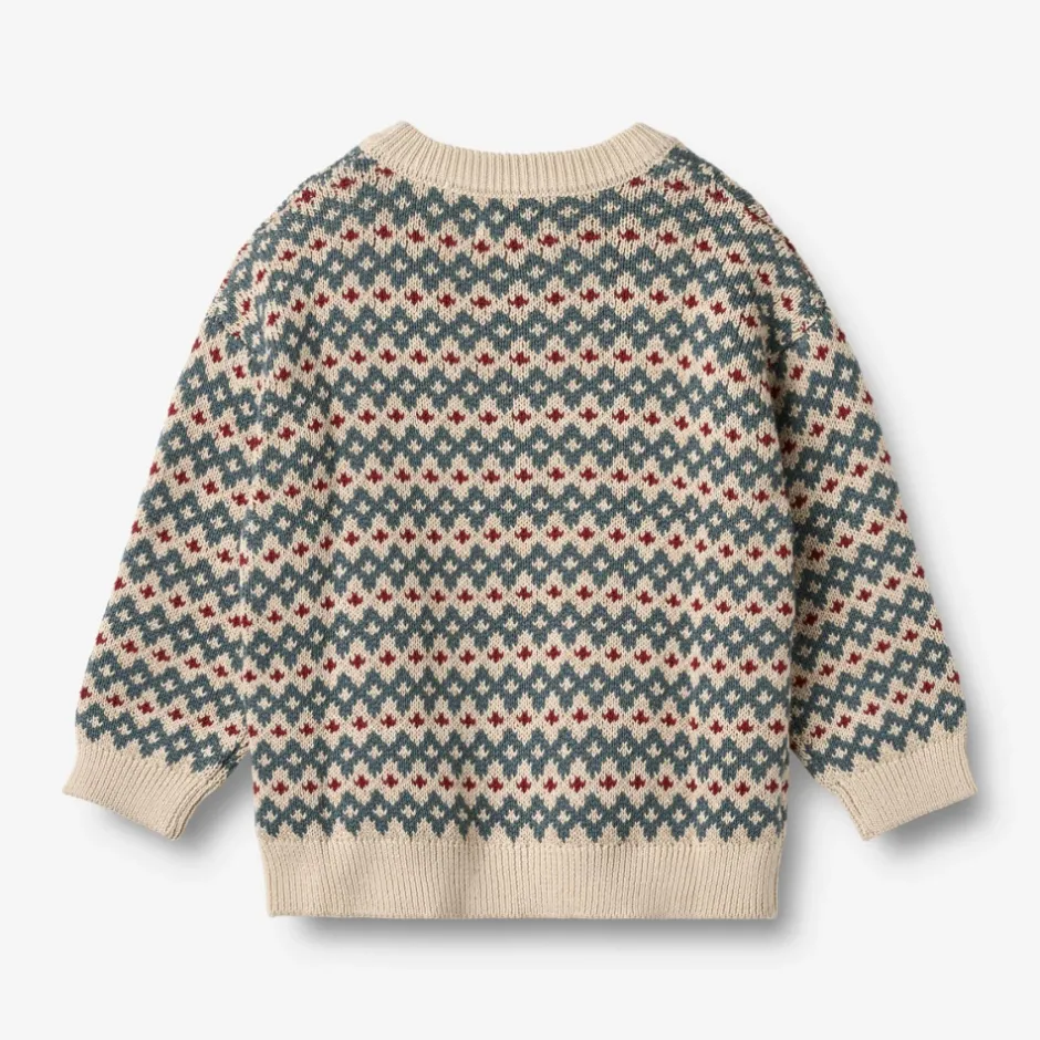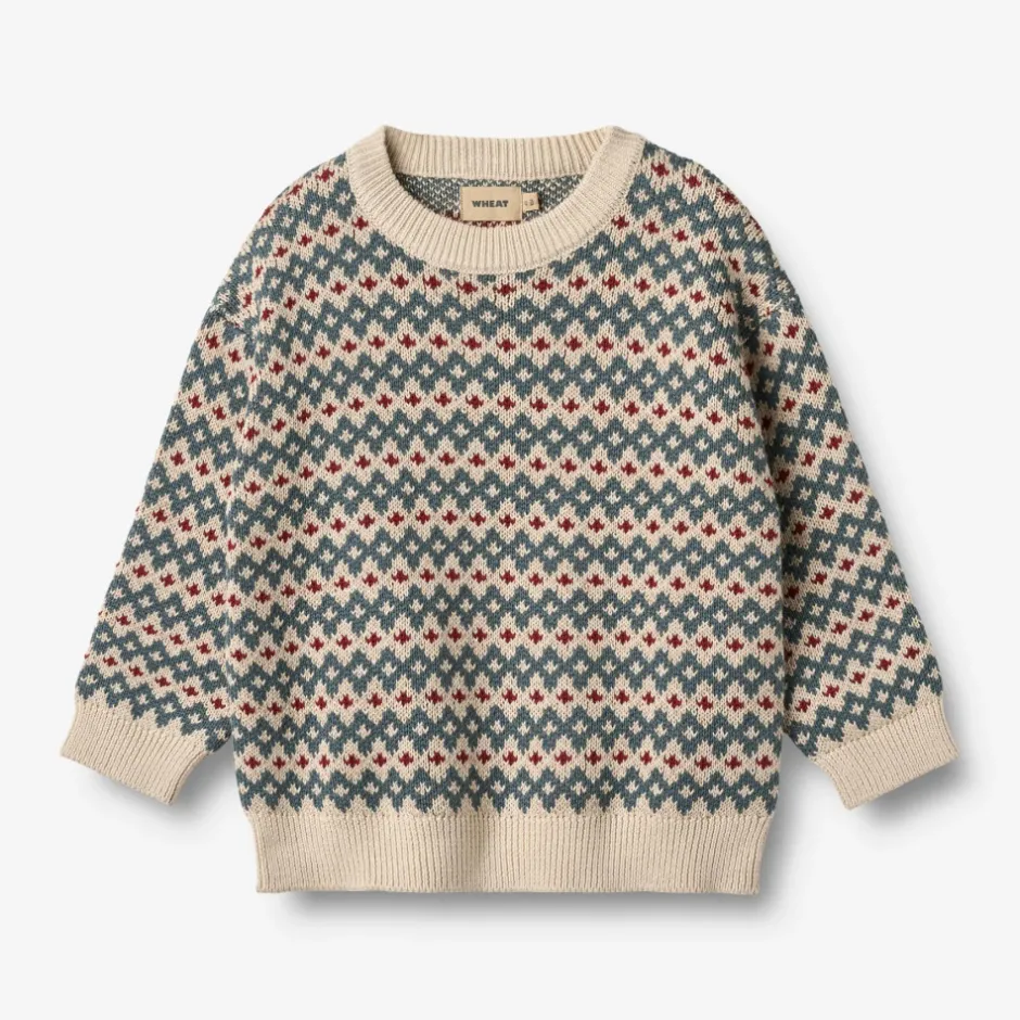Langærmet striktrøje med mønster i blødt økologisk bomuld til børn. Wheat’s strik er en tro følgesvend i de kolde efterårs- og vintermåneder, da det er blødt og behageligt for dit barn at have på uden nogen form for kløe. Wheat strik har et klassisk look med en afslappet pasform, der gør det nemt at style med et par bukser eller over en kjole alt efter vejr og begivenhed.