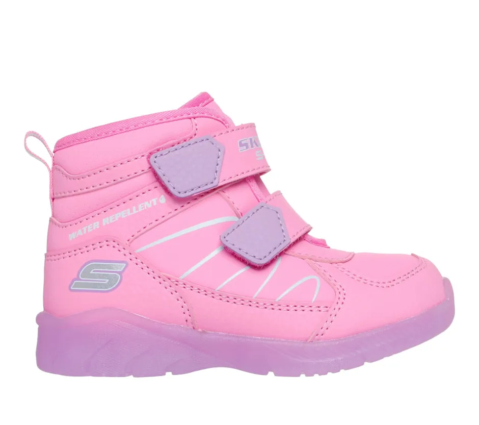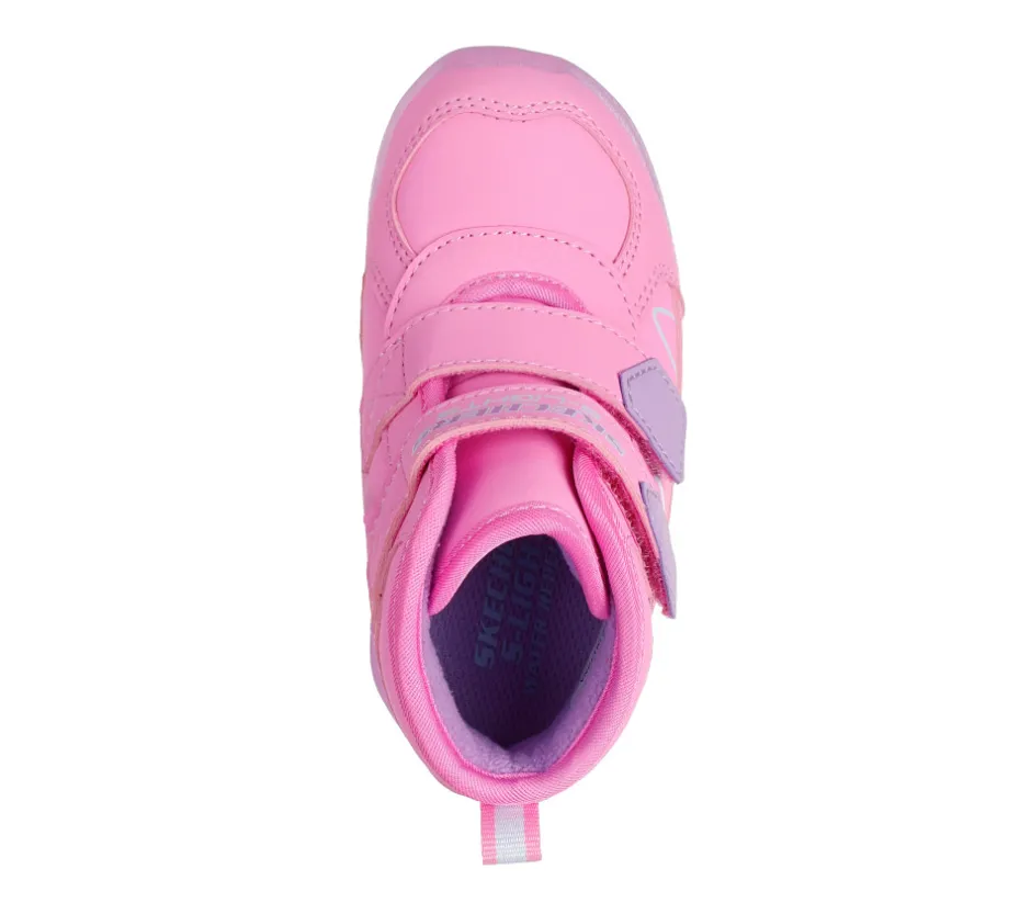 SKECHERS Illumi-Brights – PKMT er den perfekte støvle til aktive børn, der elsker farver og lys. Støvlen har en vandafvisende overflade, som holder fødderne tørre på regnfulde dage, og de indbyggede lys i sålen gør hvert skridt til en fest. Med den praktiske velcrolukning er det nemt for barnet selv at tage støvlerne af og på, og den bløde polstring sikrer god komfort hele dagen. Ydersålen er skridsikker, så barnet står sikkert på både legepladsen og i skolegården. SKECHERS’ velkendte kvalitet og design gør Illumi-Brights til et oplagt valg for både leg og hverdag.