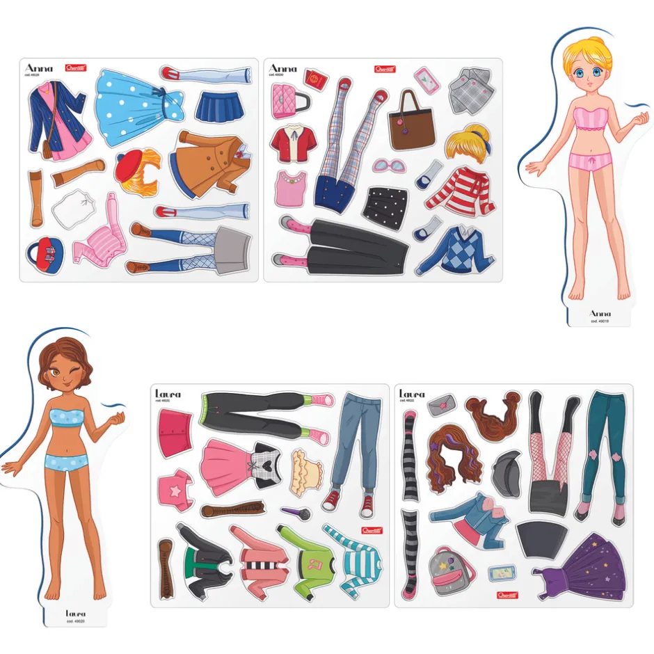 Hvem husker ikke de flotte påklædningsdukker af papir? Quercettis Magnetic Fashion tager legen til nye højder med store magnetiske dukker, der kan stilles oprejst ved hjælp af de to medfølgende plastfødder. Klæd de to veninder på på tusind forskellige måder og lad dem tage på spændende og sjove eventyr – kun fantasien sætter grænsen!