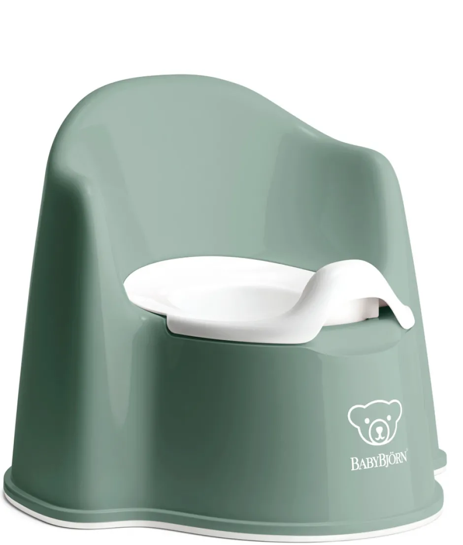 Pottestol med praktisk indsats og bløde former. BabyBjörn` s Pottestol er med sin høje ryg og komfortable armlæn et godt sted at begynde livet uden bleer. Det ergonomiske design tilbyder masser af benplads og den indre potte har tisseværn og er nem at tage ud ved tømning og rengøring. BabyBlörn pottestolen har bløde former fordi det skal være en komfortabel oplevelse at sidde på den.