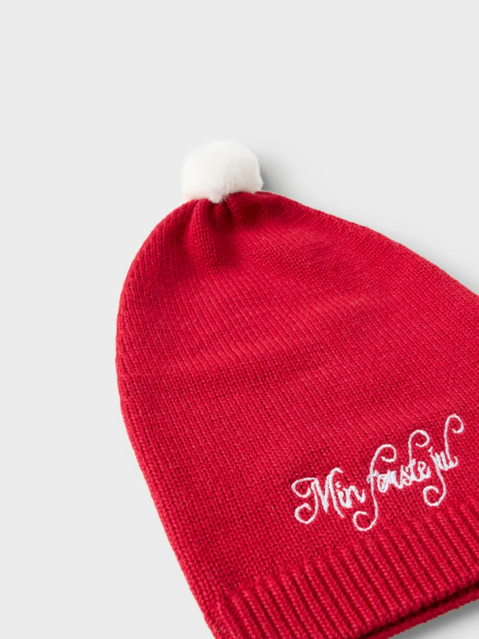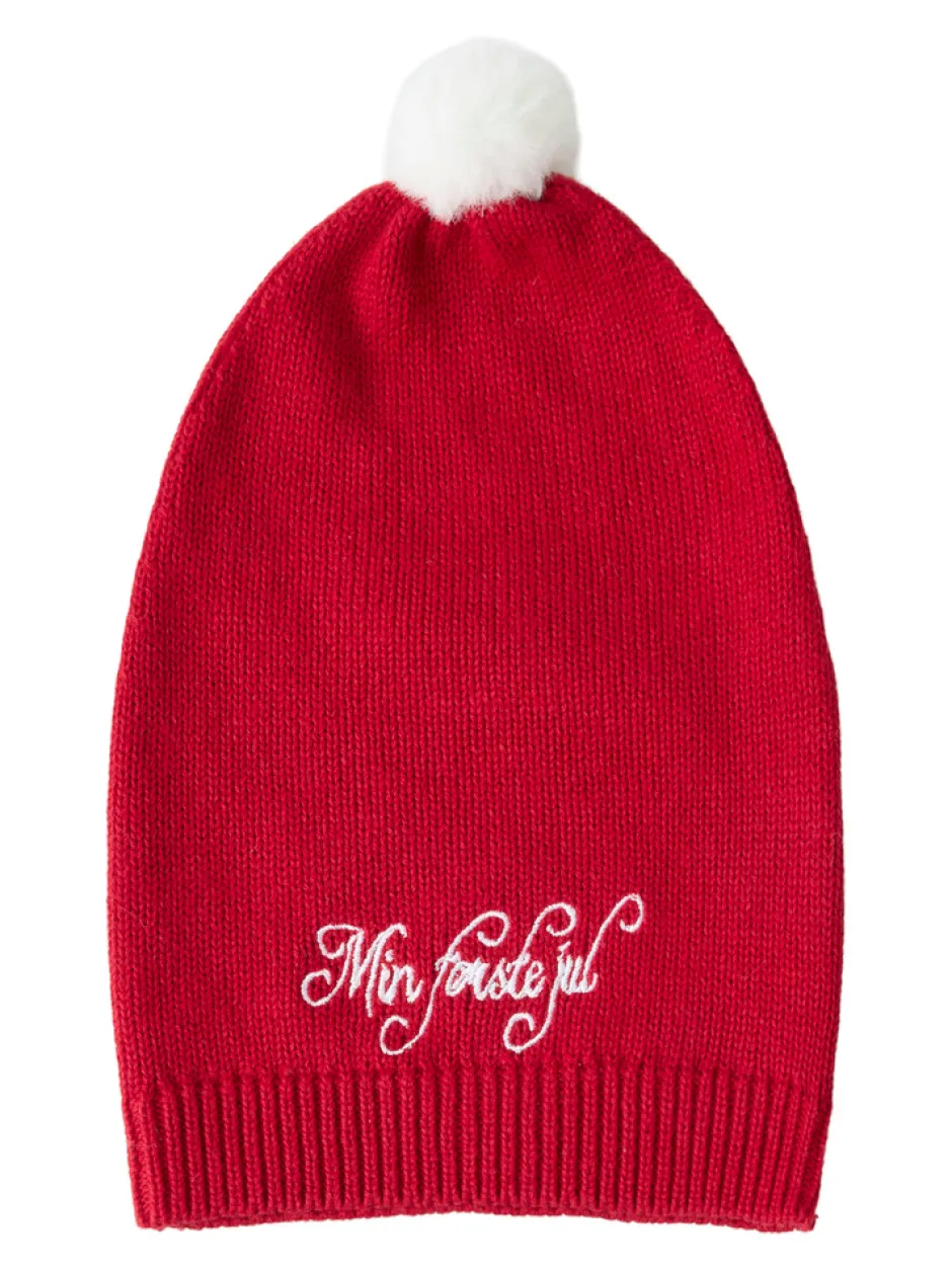 - Strikket hue i flot julerød farve