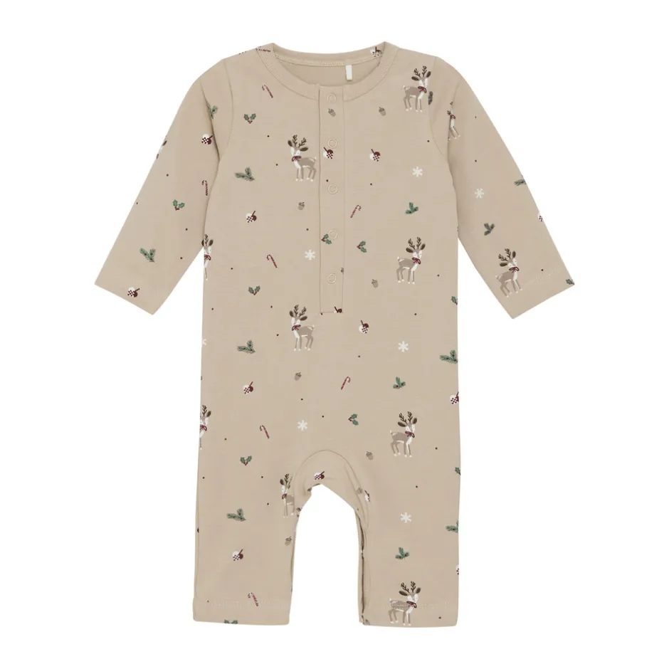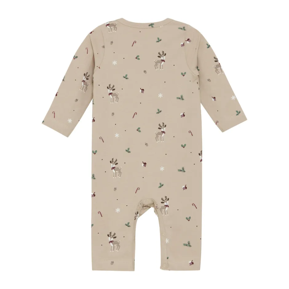 Heldragt fra FIXONI med juleinspireret all-over-print. Denne ensfarvede heldragt har et fint julemotiv og lukkes nemt med praktiske trykknapper foran, hvilket gør den let at tage af og på. Den er fremstillet i en blød og behagelig kvalitet, der er skånsom mod barnets hud.