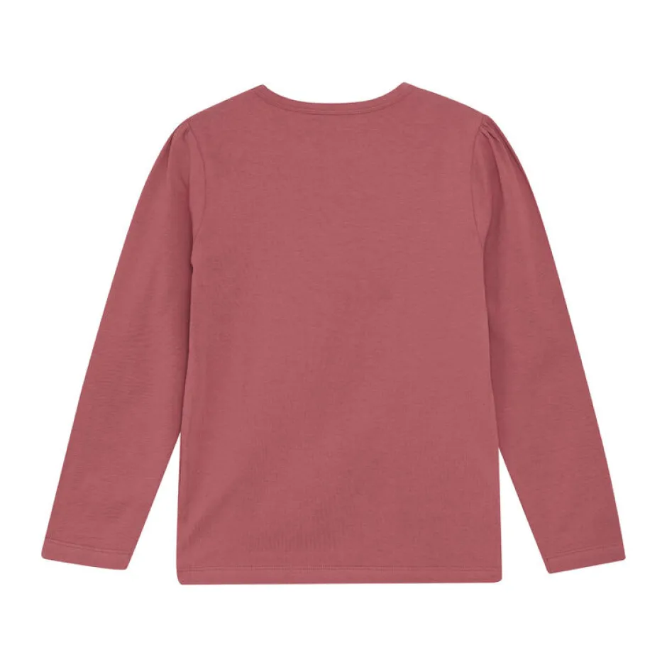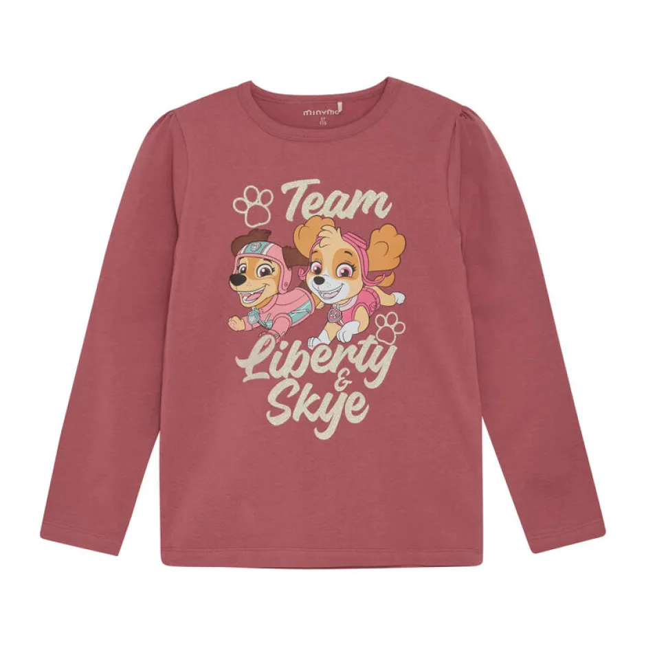 Langærmet bluse med Paw Patrol print fra Minymo. T-shirten har et stort print med Liberty og Skye fra Paw Patrol fortil, hvor der også står “Team Liberty & Skye”. T-shirten har fine stofsamlinger ved skulderen, som giver et flot piget look. På størrelse 92 lukkes t-shirten med skjulte trykknapper på skulderen.