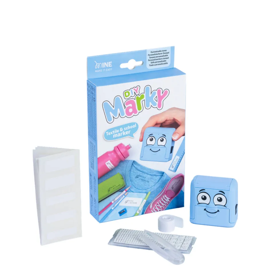 Smart DIY MARKY stempel i flot lyseblå farve til mærkning af dit tøj, drikkedunk, rygsæk, madkasse og lignende.