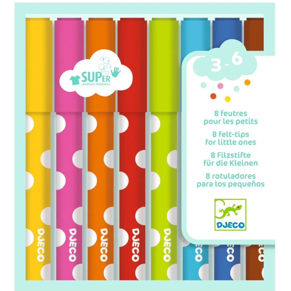 Tykke tuscher for de små , der er gode at holde om, og som nemt kan vaskes af huden, hvis de får tegnet på sig selv.